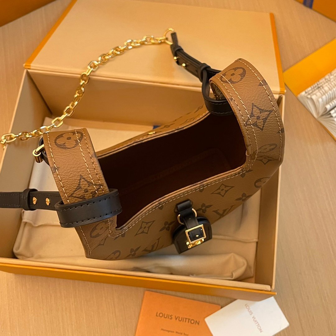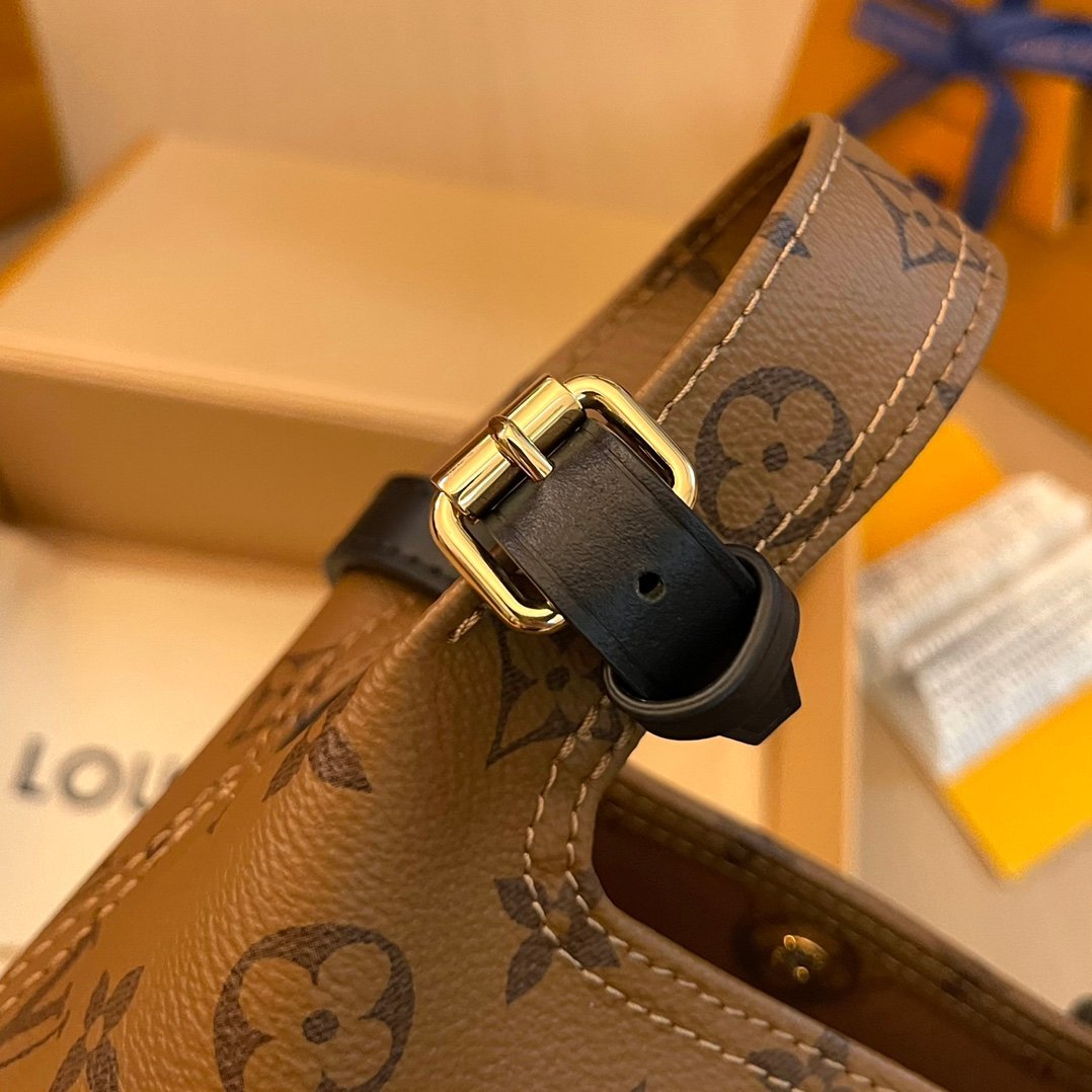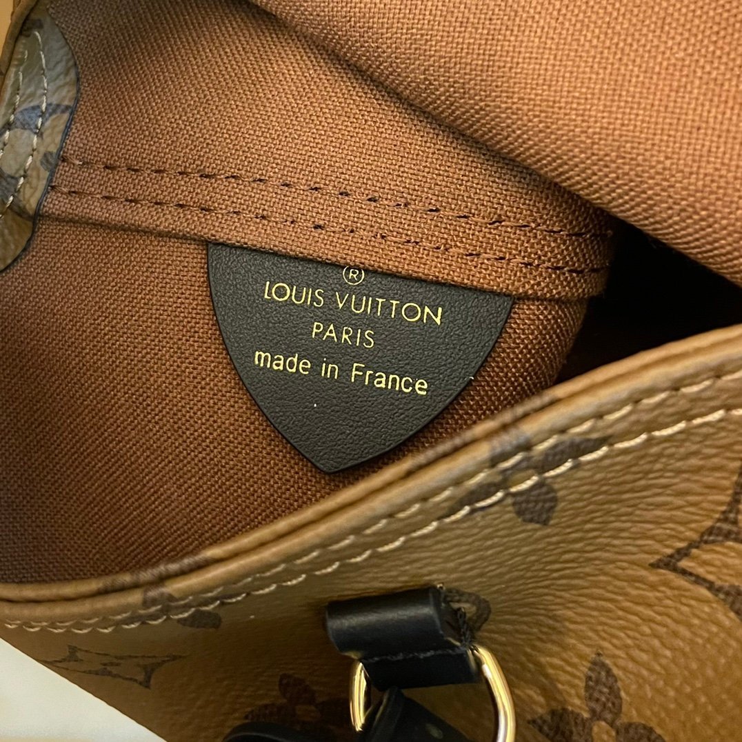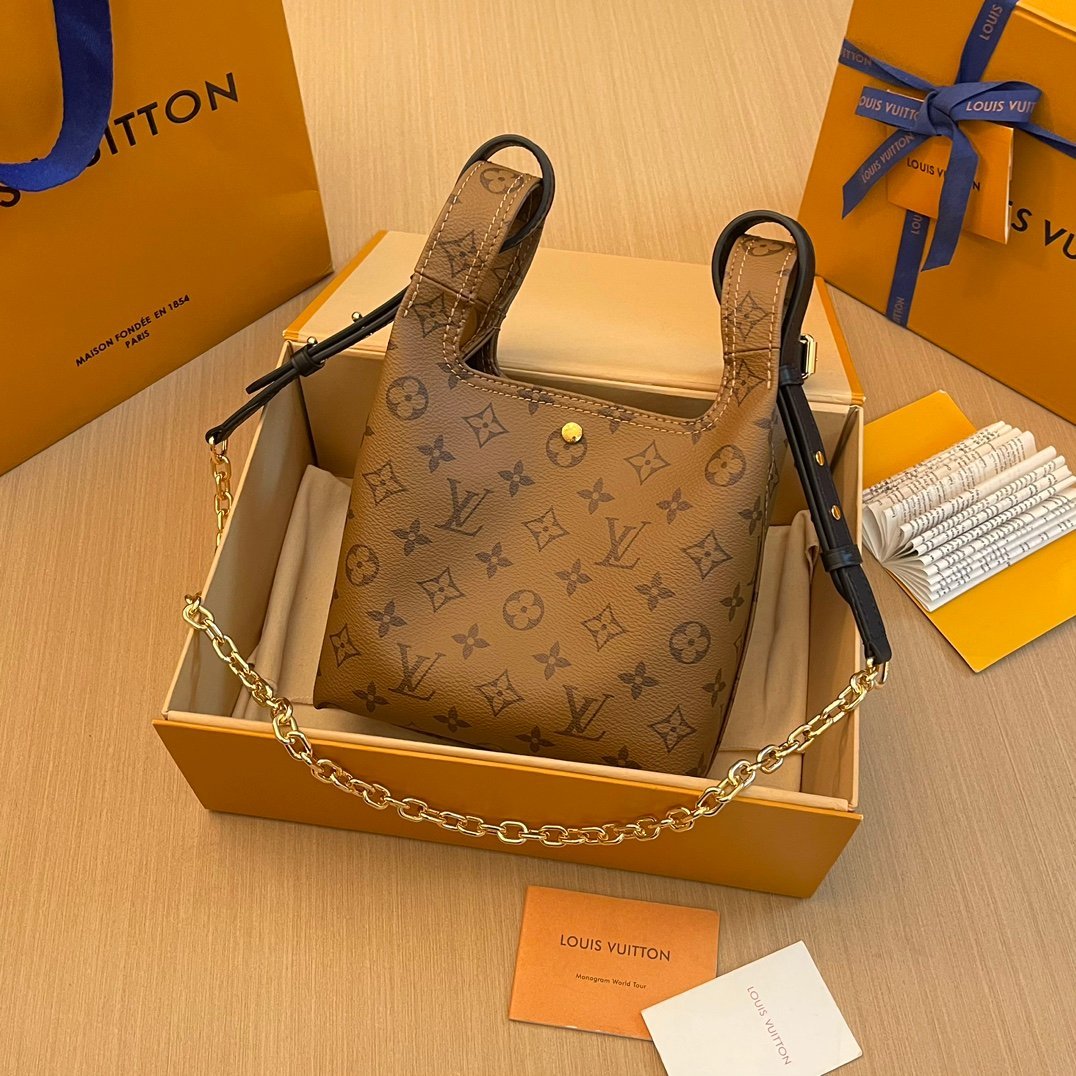 The Atlantis BB handbag is made from Monogram Reverse canvas with dark cowhide-leather trim, including on the LV name tag and detachable shoulder strap. The fashion-forward shape, inspired by the shopping bag, and supple construction make it body-friendly. An adjustable, removable strap enables cross-body carry.