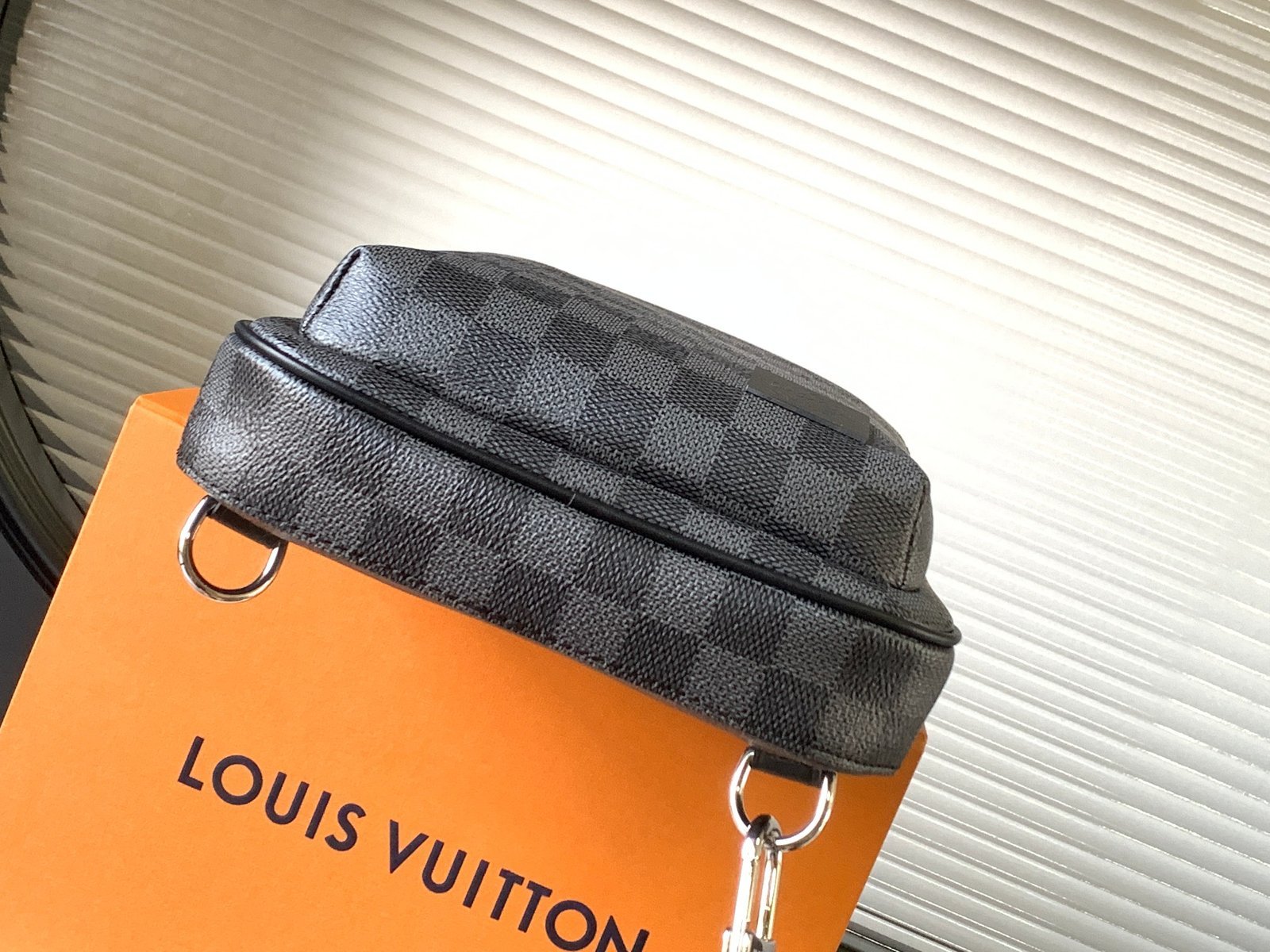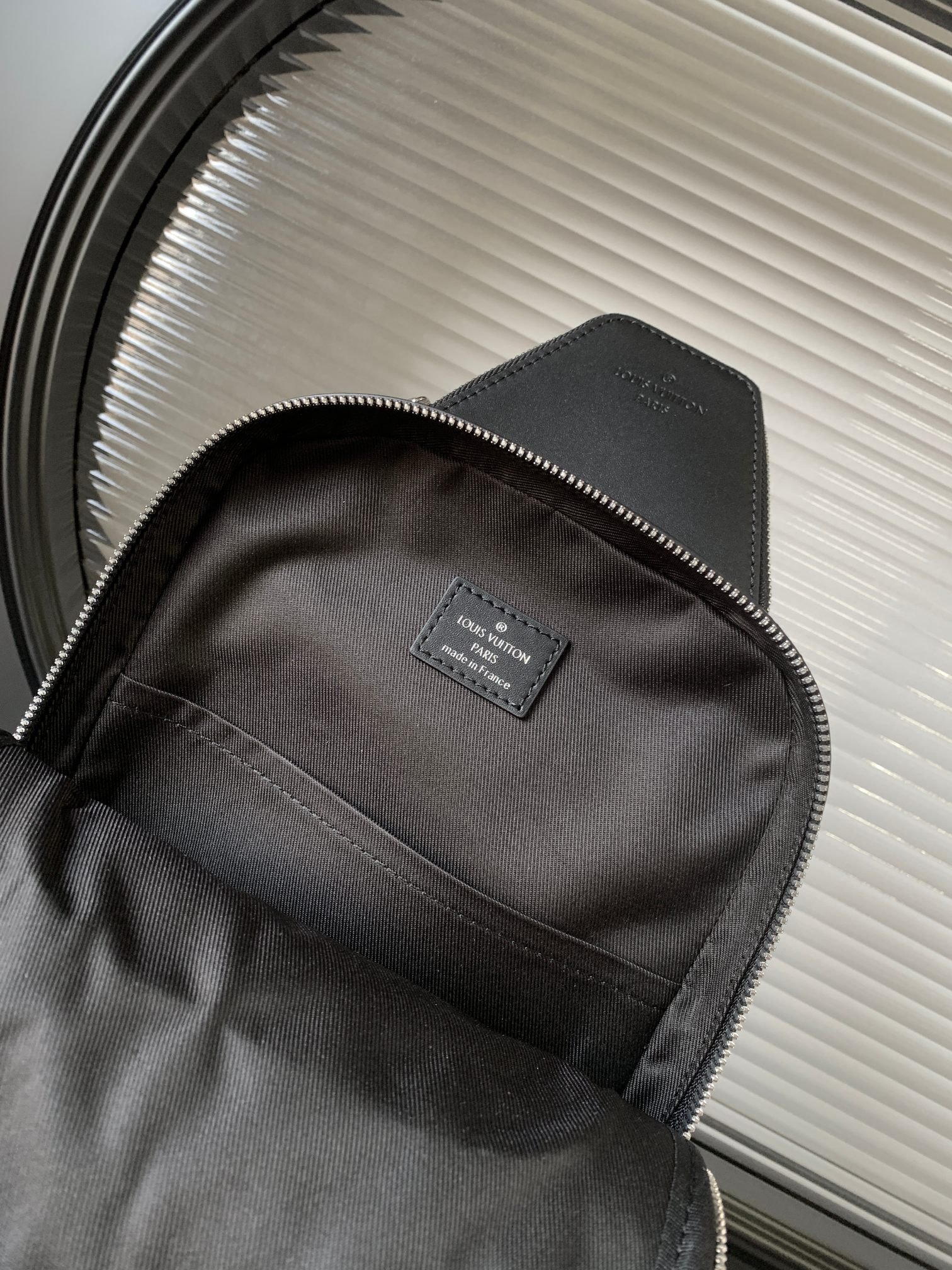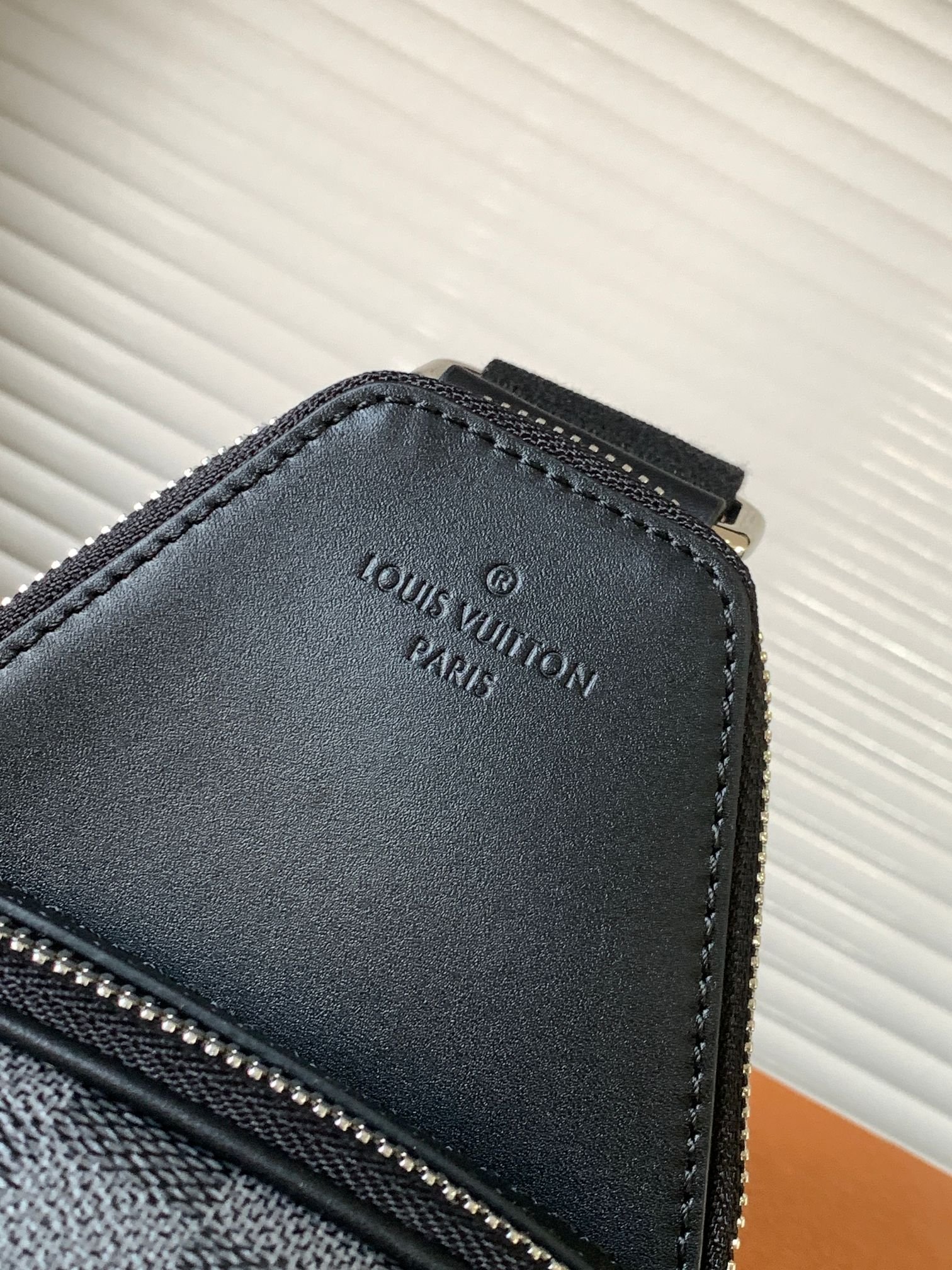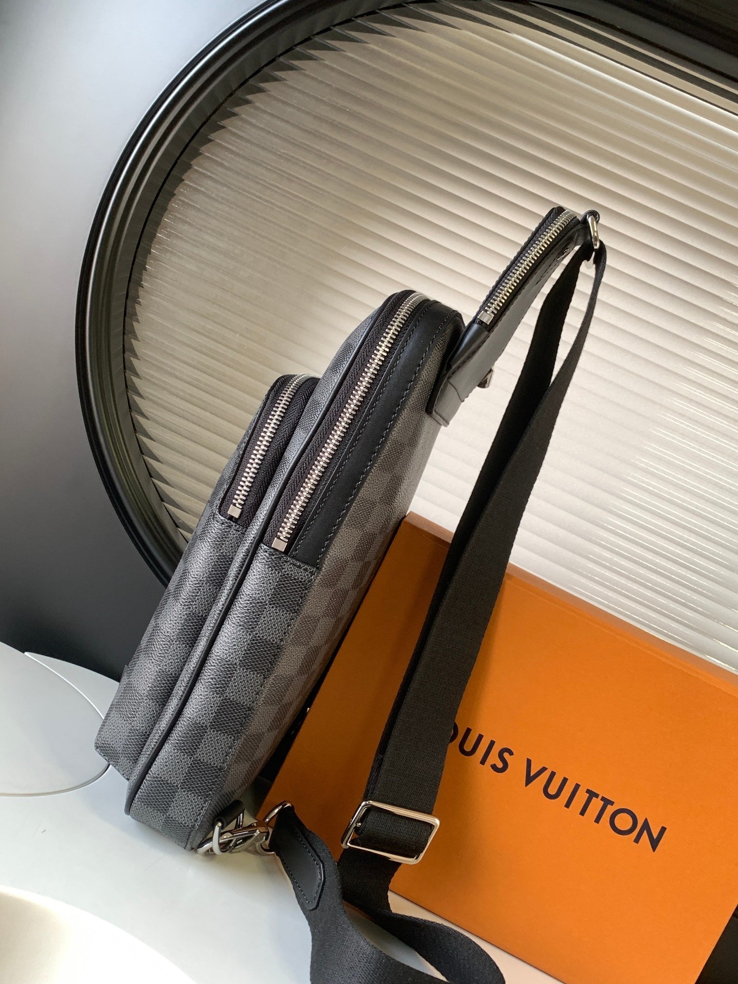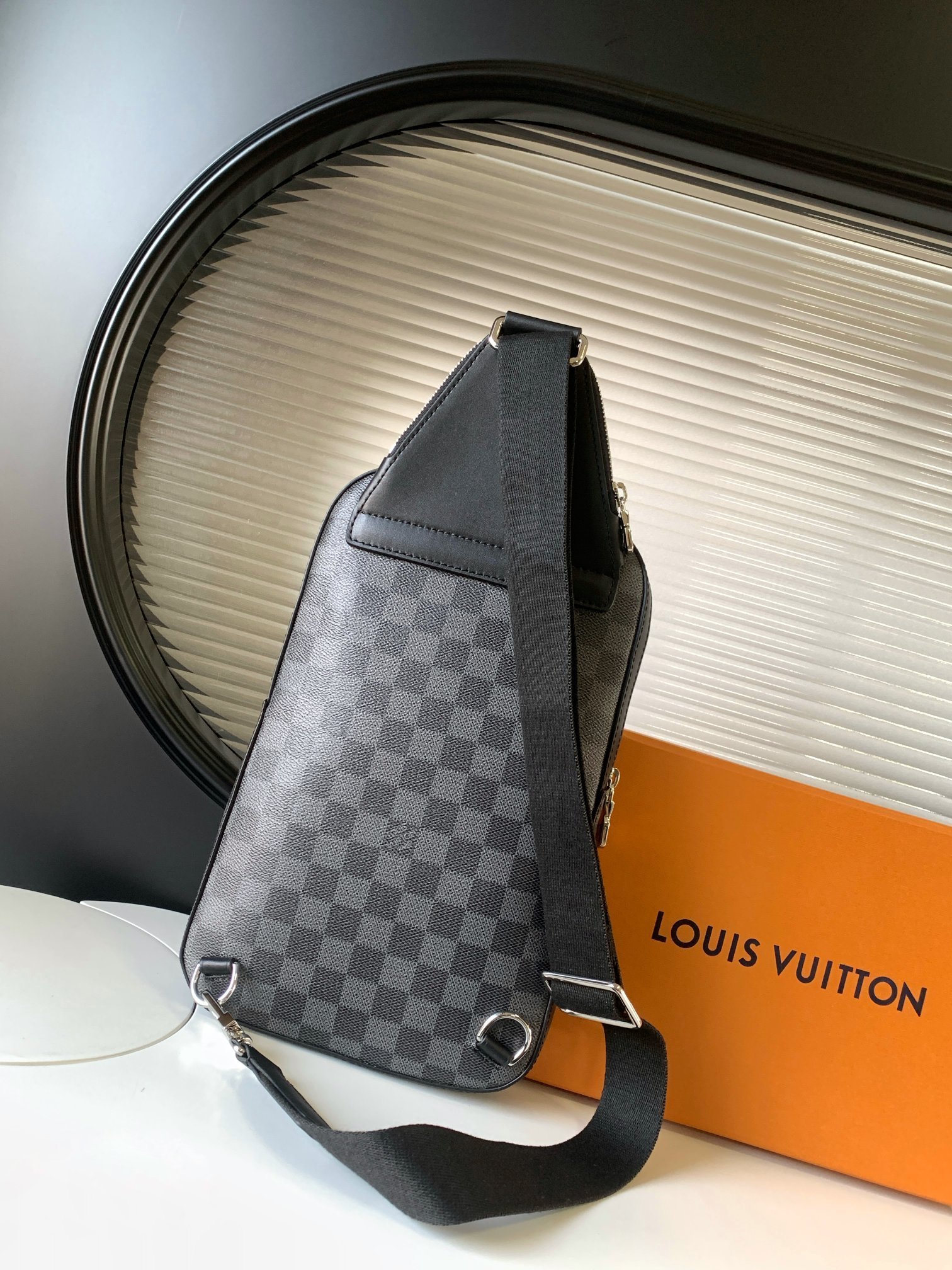The Avenue Slingbag is made from Damier Graphite canvas with a Louis Vuitton Paris leather patch on the front outside pocket, bringing a contemporary twist. The adjustable nylon strap can be attached to the D-ring on right or left side of the bag. It’s more sustainable than earlier models, thanks to its canvas strap and lining.