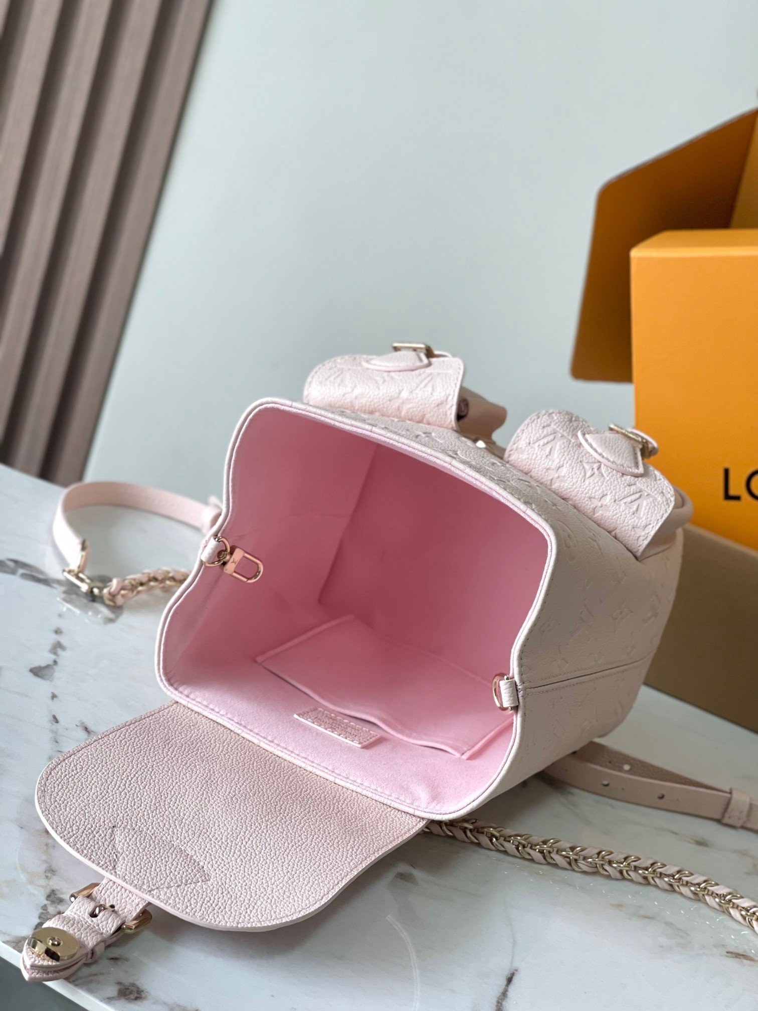 The playful Backup backpack is made from Monogram Empreinte leather, with the Monogram pattern subtly embossed into the cowhide. This versatile bag can be carried on the back or shoulder, thanks to its adjustable strap, by hand, with its sturdy top handle, or even cross-body using the braided chain.