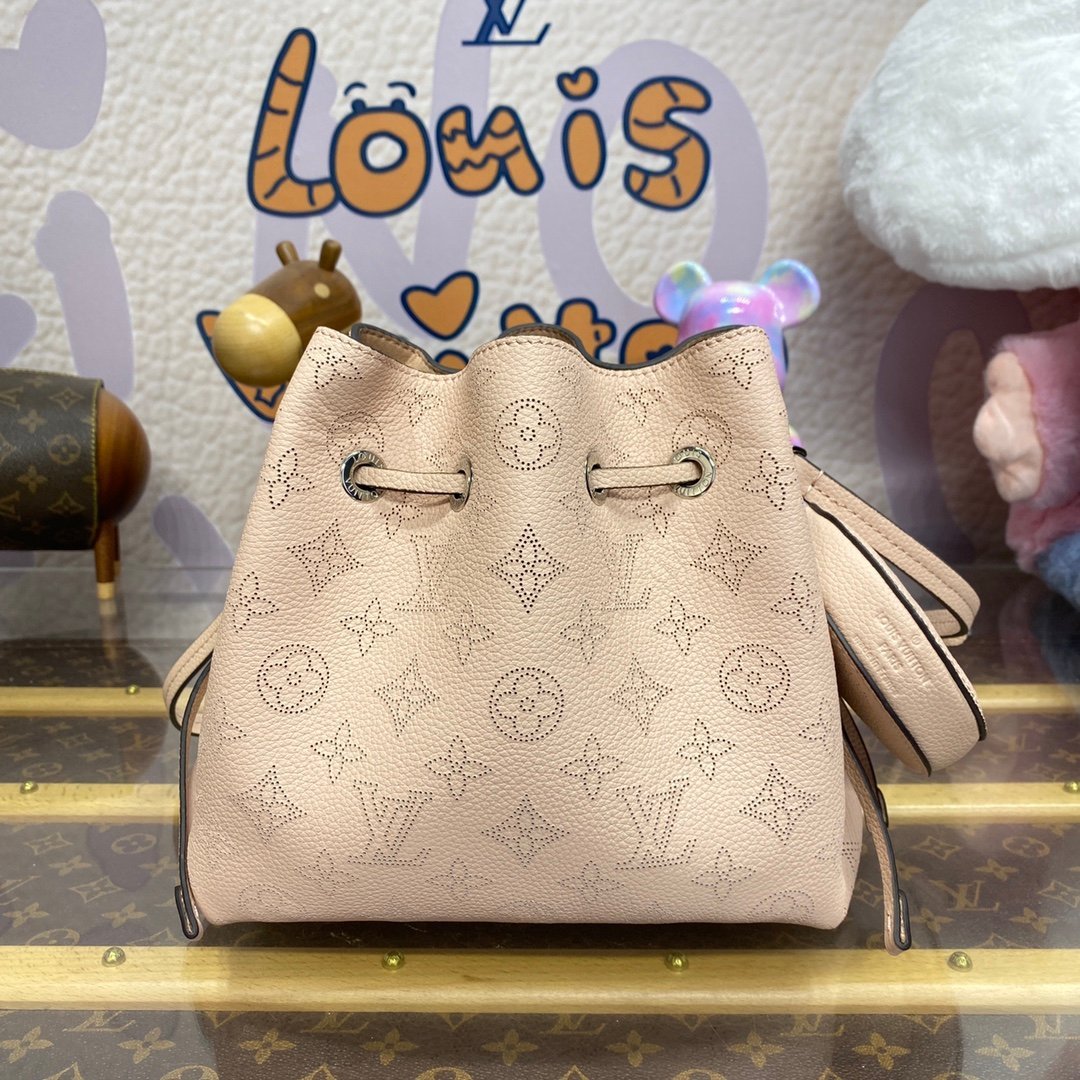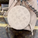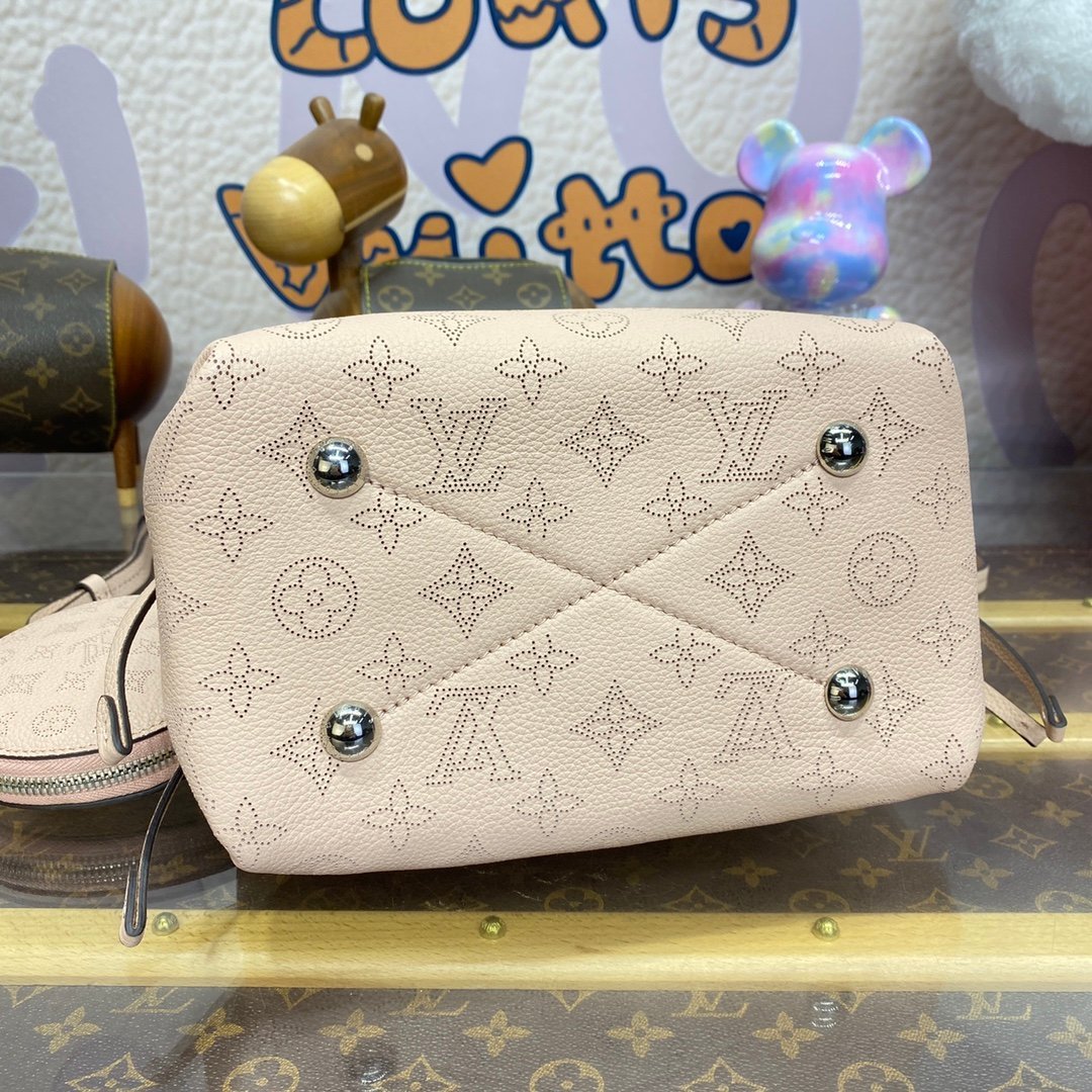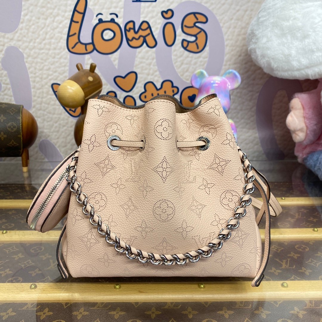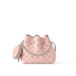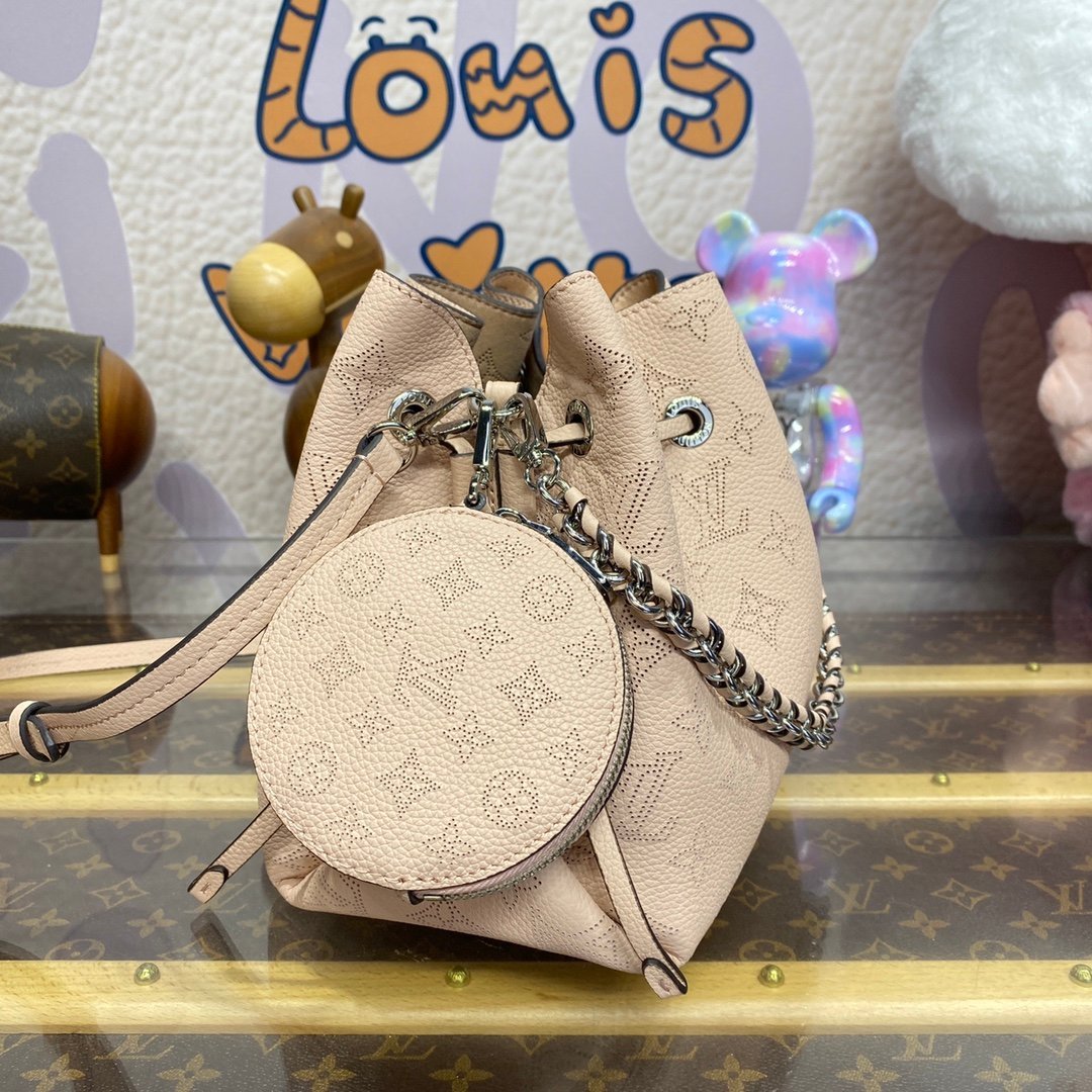 A fresh and feminine colorway brings charm to this adorable Bella bucket bag in Mahina perforated calfskin. The round coin purse in matching Mahina leather and the silver-color chain add a casual elegance to the design. The adjustable and removable leather strap enables shoulder and cross-body carry.