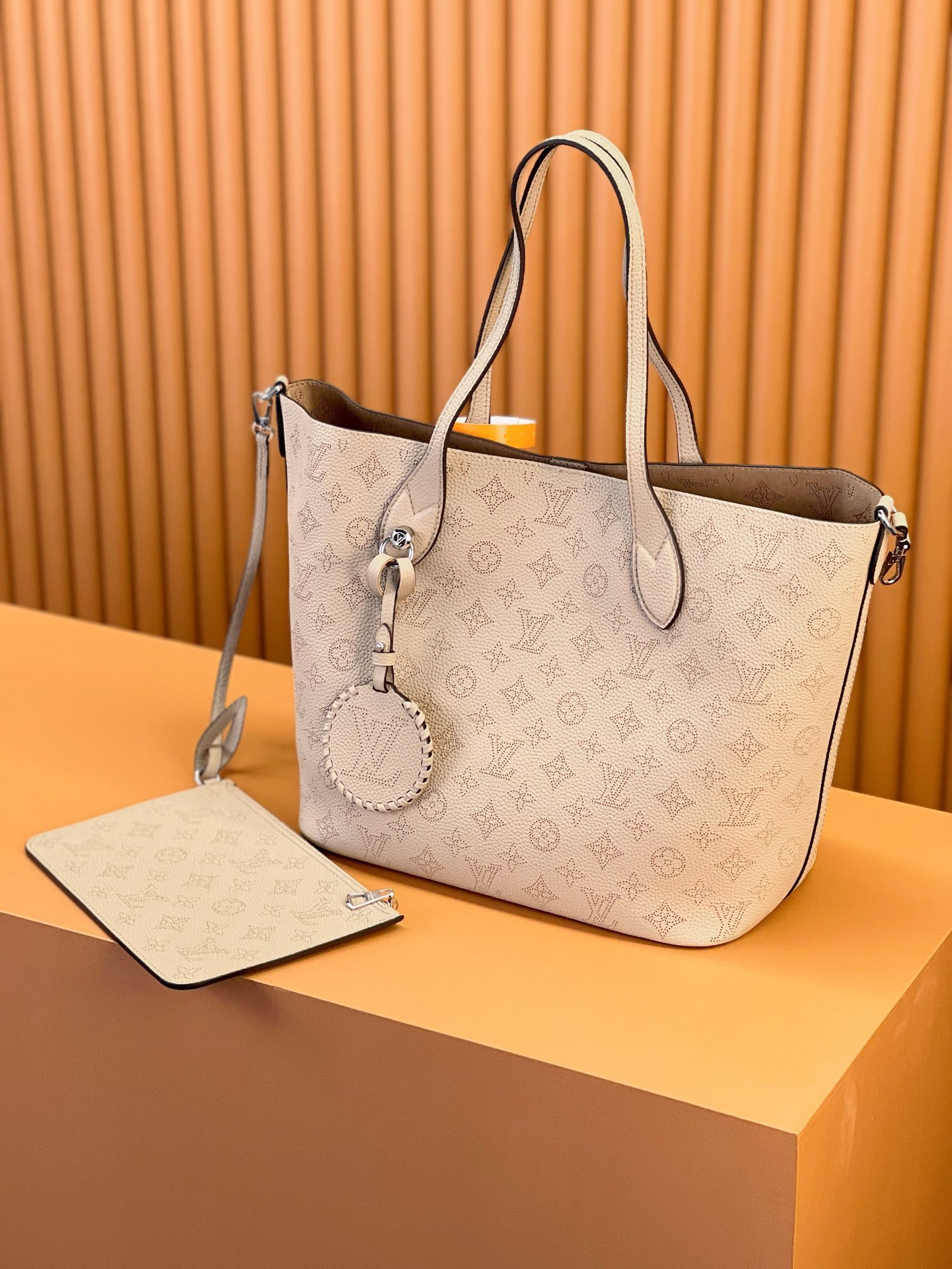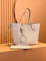 The Blossom MM tote bag is made from Mahina calfskin, with the Monogram pattern delicately perforated into the leather. The supple, lightweight calfskin highlights the draped effect of the design and makes it very body-friendly. It’s signed with a leather tag, featuring perforated LV Initials circled in leather braiding. Two long handles allow shoulder carry.