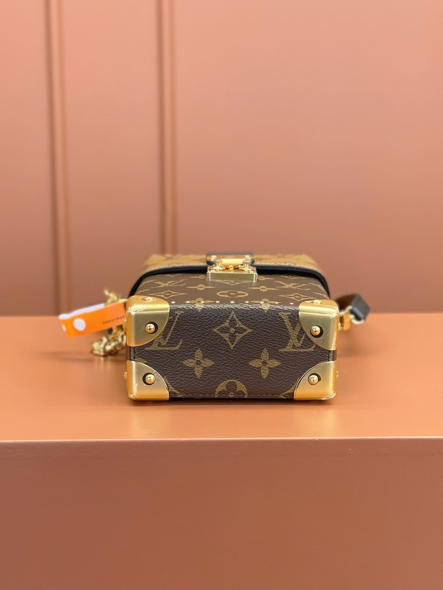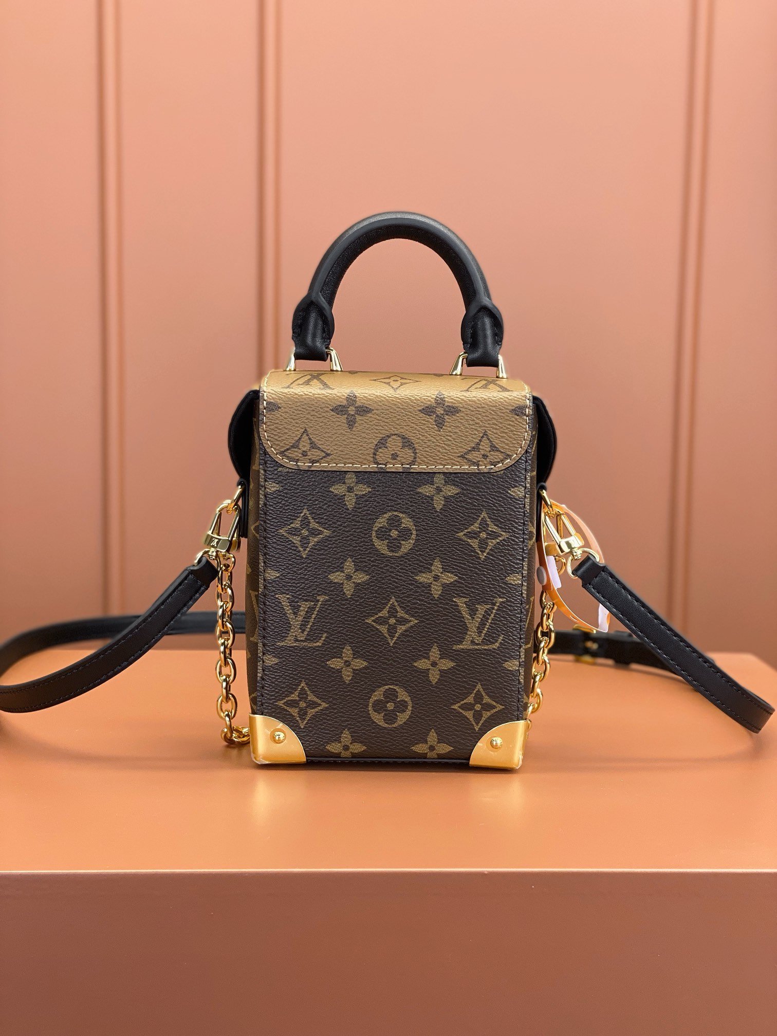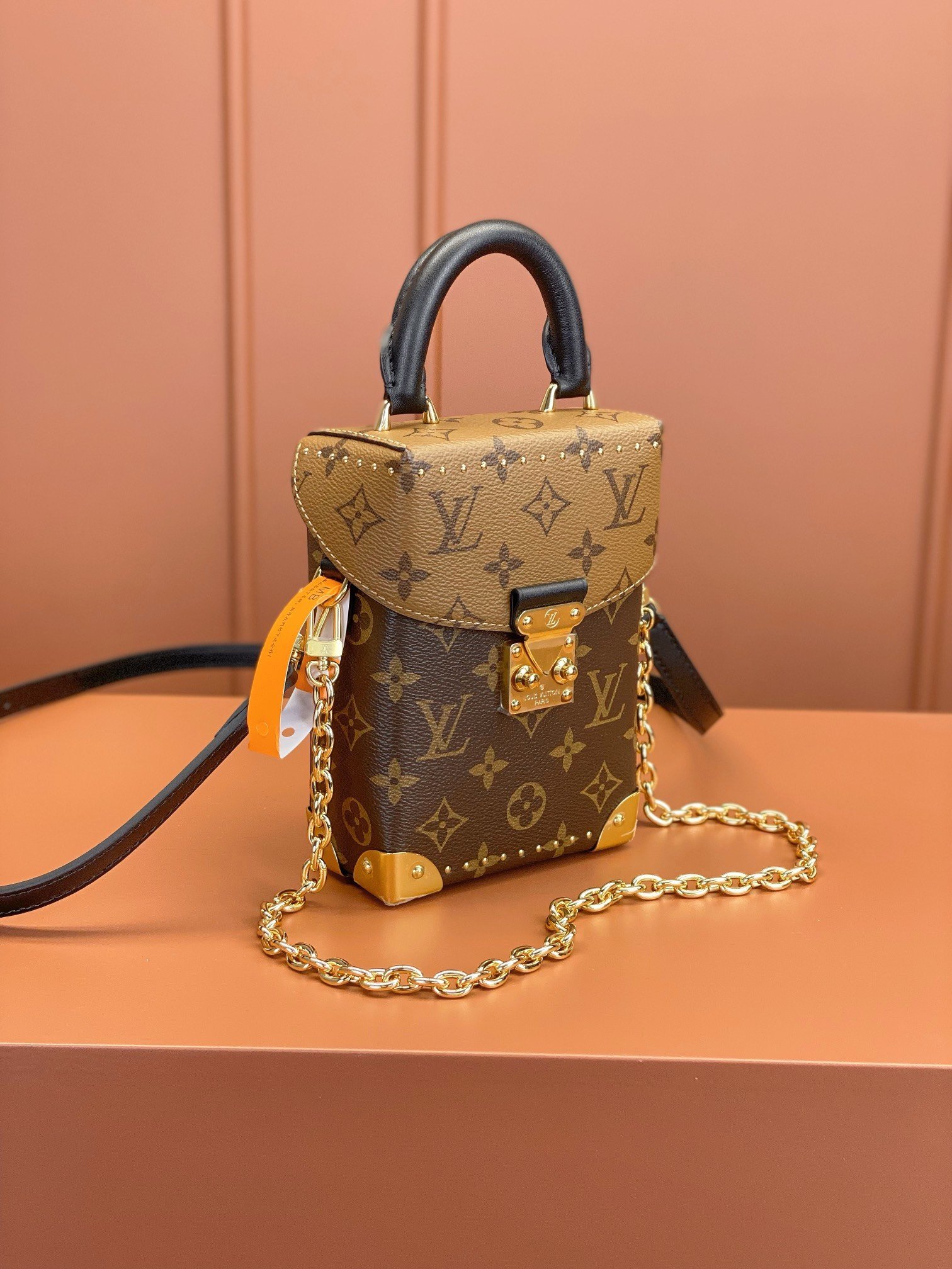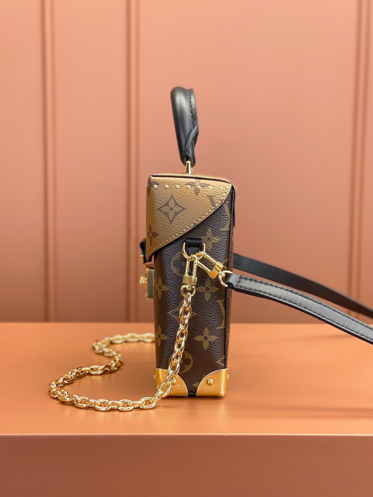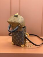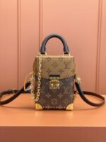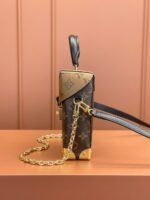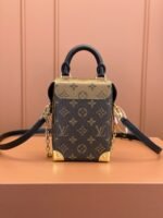 The Camera Box handbag combines all the Petite Malle’s signature details – S-lock, metallic corners, rivets, and a mix of Monogram and Monogram Reverse are all here – but on a modern shape. A thin gold-color chain brings a feminine touch to the bag while the pivoting top-handle adds a comfortable carry option.