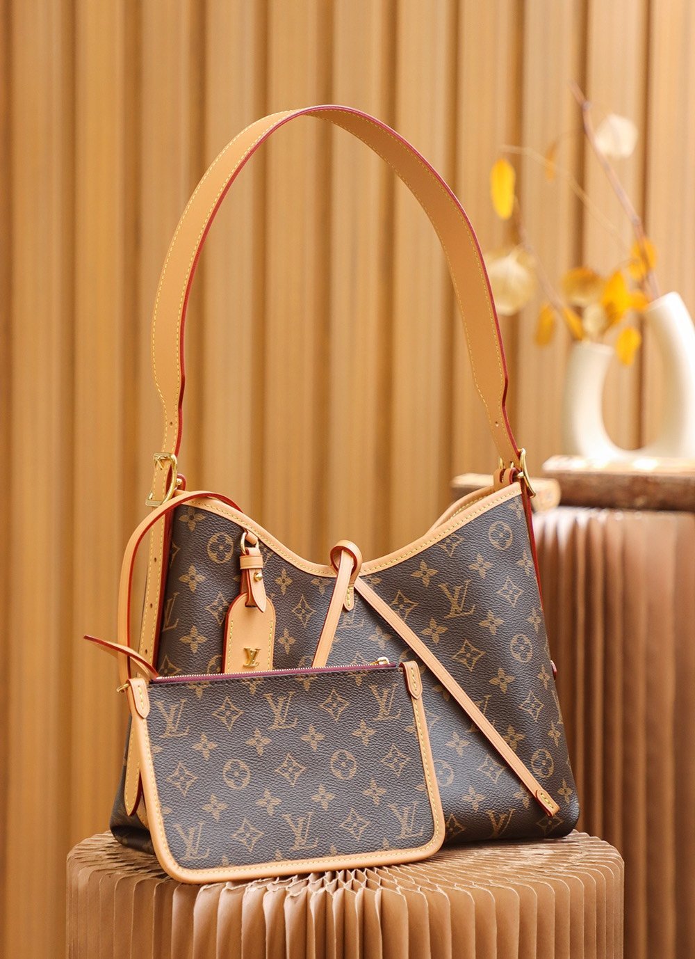 Combining allure with body-friendly design, the CarryAll PM handbag in Monogram canvas with natural leather trim is a go-everywhere city bag. Great storage capacity and a smartly designed interior, with two large inside pockets, makes it practical. A detachable zipped pouch, also in Monogram canvas, is attached to the bag by a leather strap.