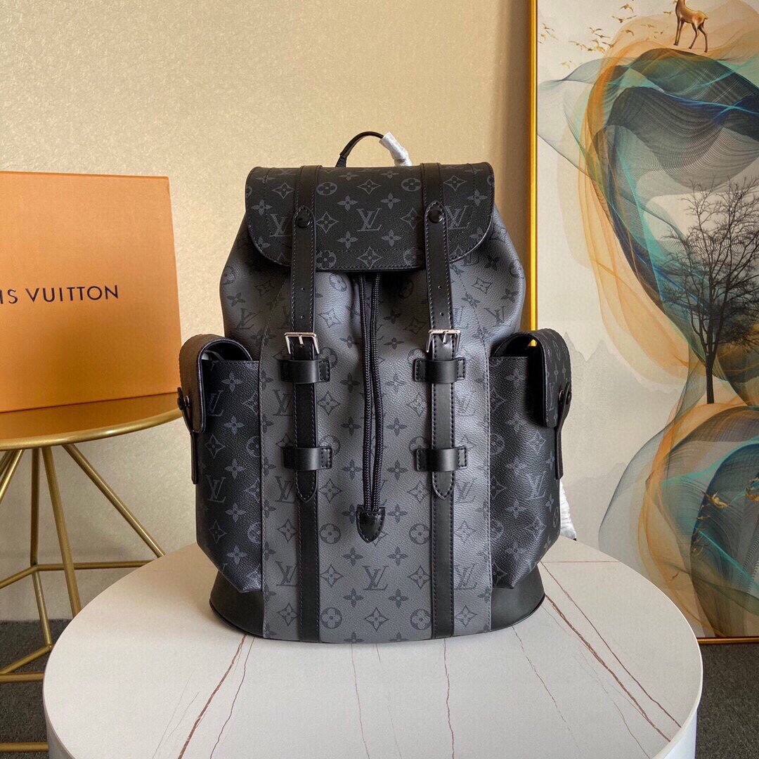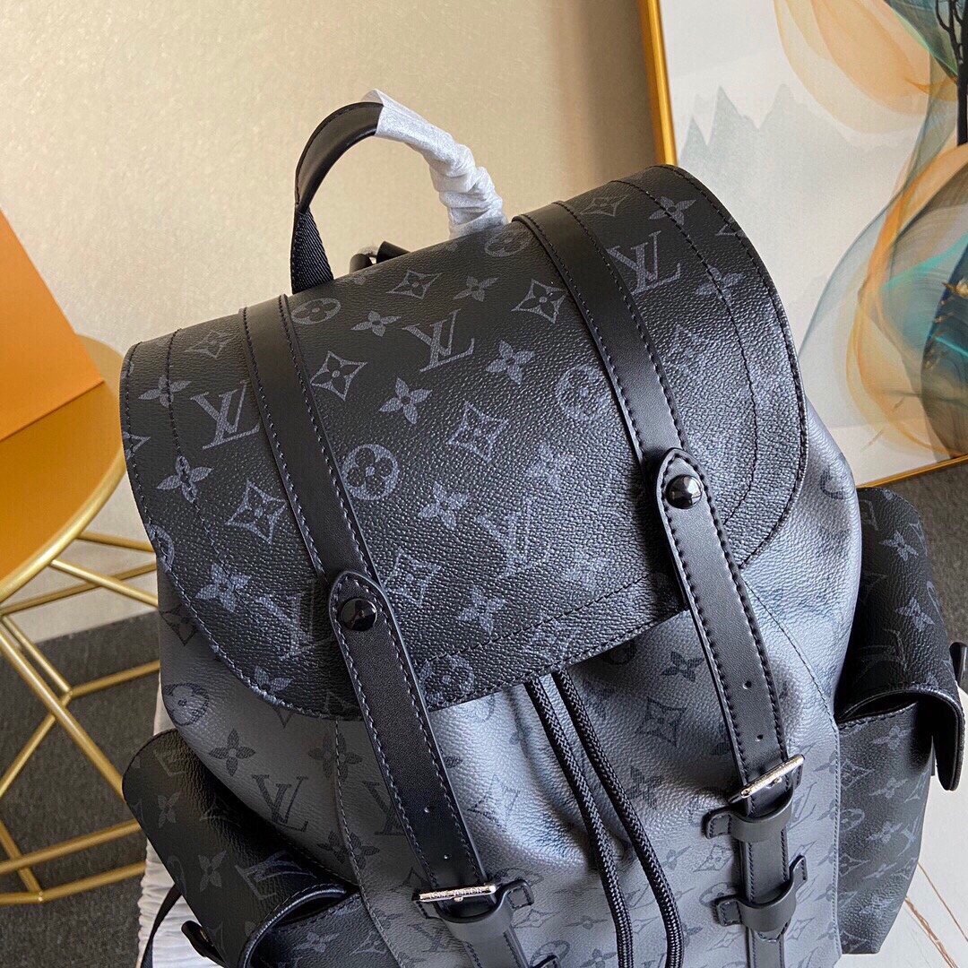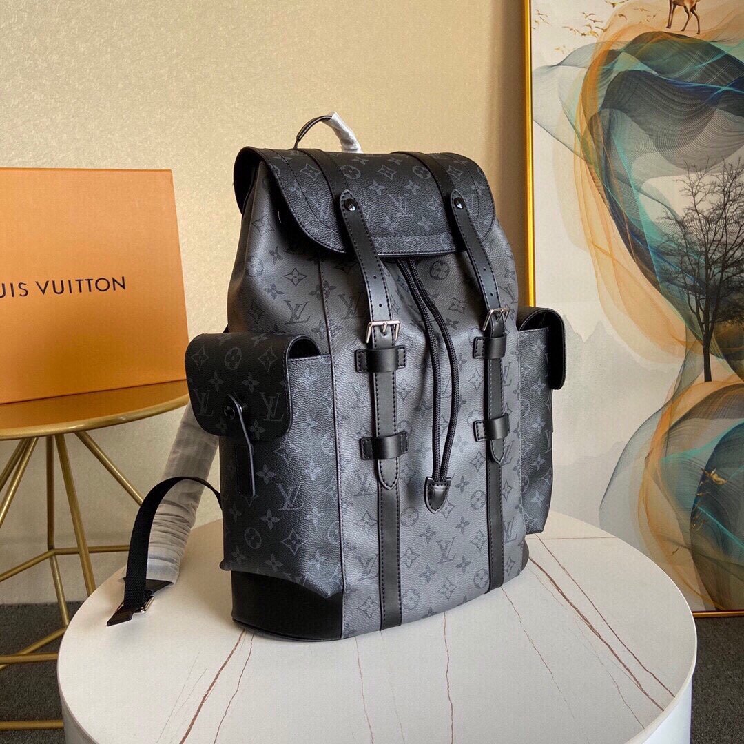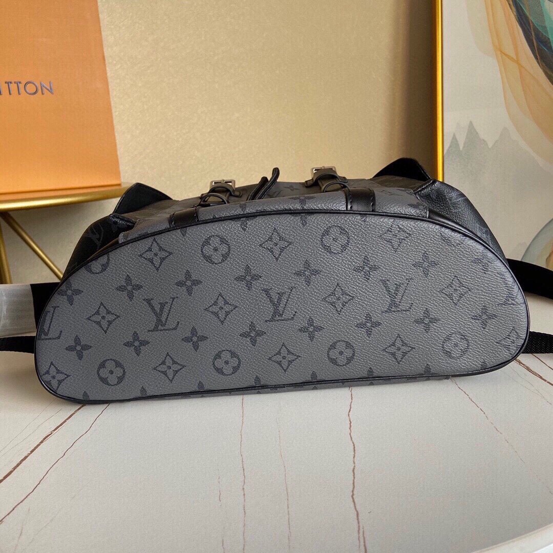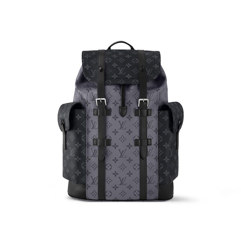 The Christopher MM backpack reinvents the rugged spirit of a hiking pack in masculine Monogram Eclipse canvas and Monogram Eclipse Reverse canvas with black leather trim. The grays and blacks are complemented by the silver highlights of the buckles and zips. Multiple pockets and a leather flap with a press-stud keep belongings safe.