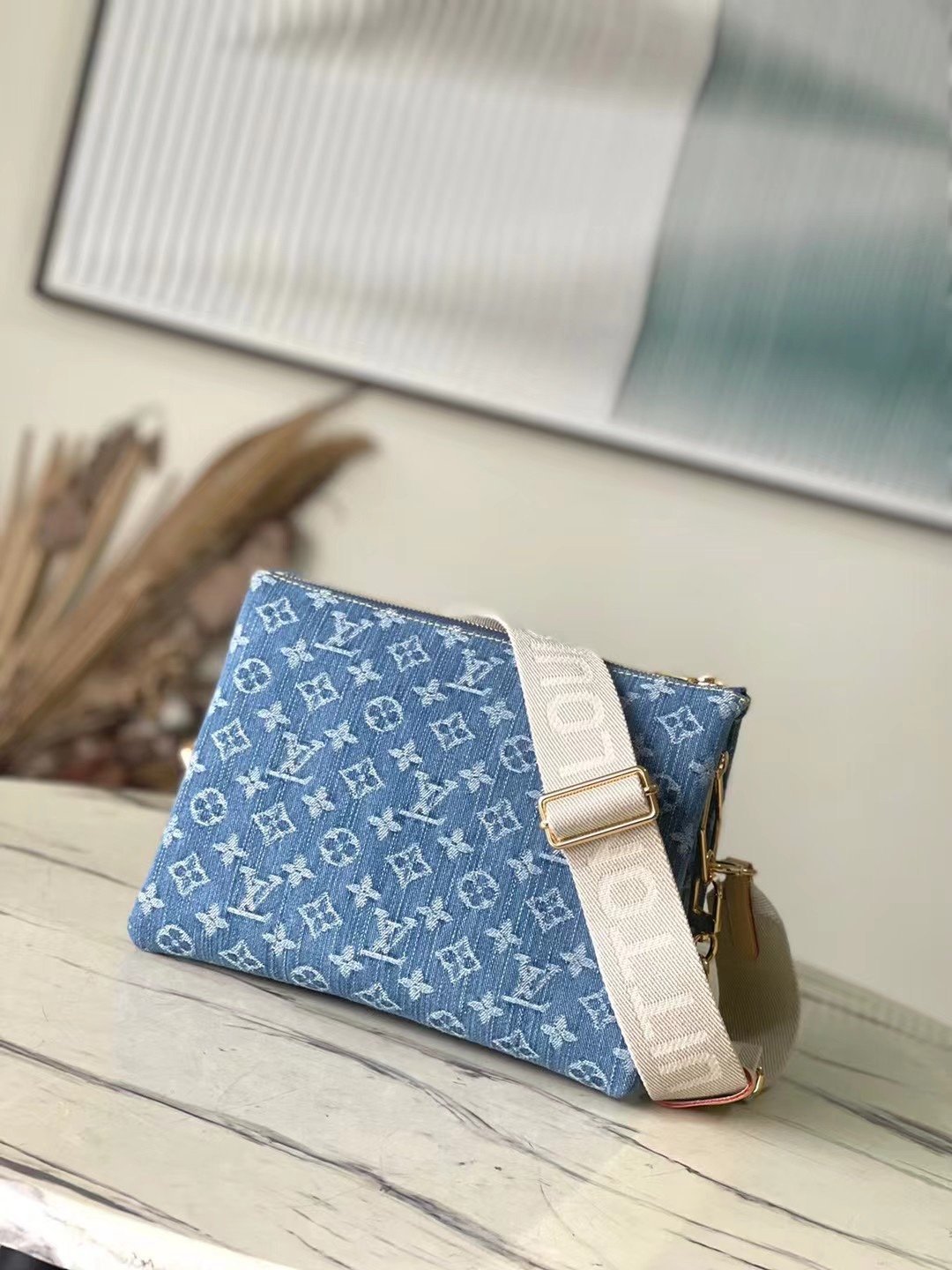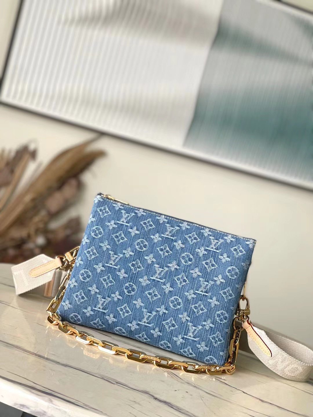 The Coussin PM handbag takes a fresh direction, with this desirable new material made from organic cotton denim. The fabric is bleached and stonewashed to give each piece a unique allure. Supple and lightweight, the bag can be styled with or without the chunky, engraved and wide textile strap – both are easily detachable.
