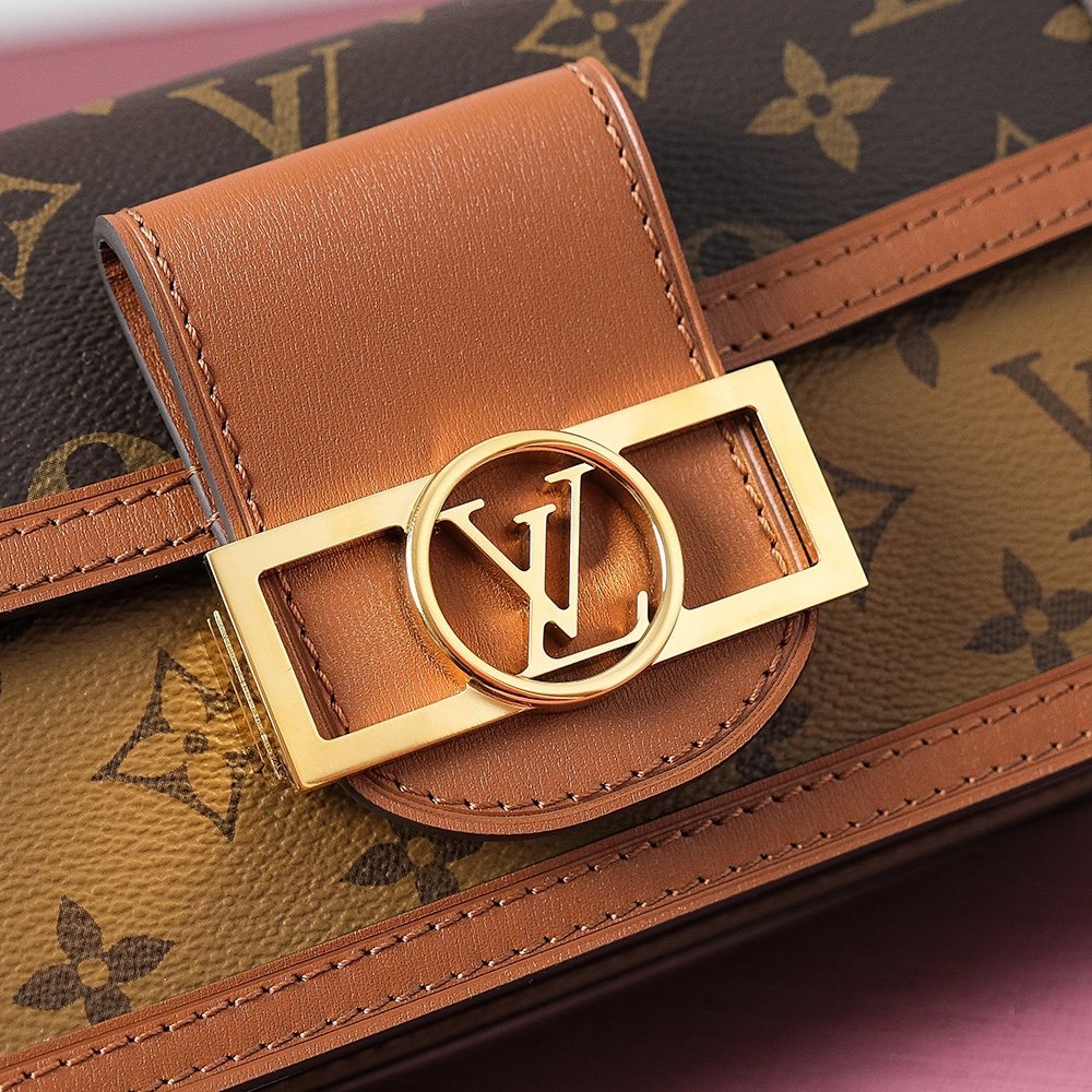 The Dauphine East-West Monogram handbag canvas sports a fashionably elongated silhouette, echoed in the Dauphine iconic rectangular LV closure. The interplay of two complementary Monogram canvases – classic and Reverse – lends this piece a signature appeal. The leather shoulder strap and the golden chain are both removable, offering a variety of styling options.