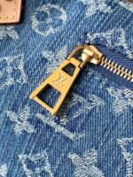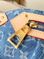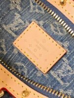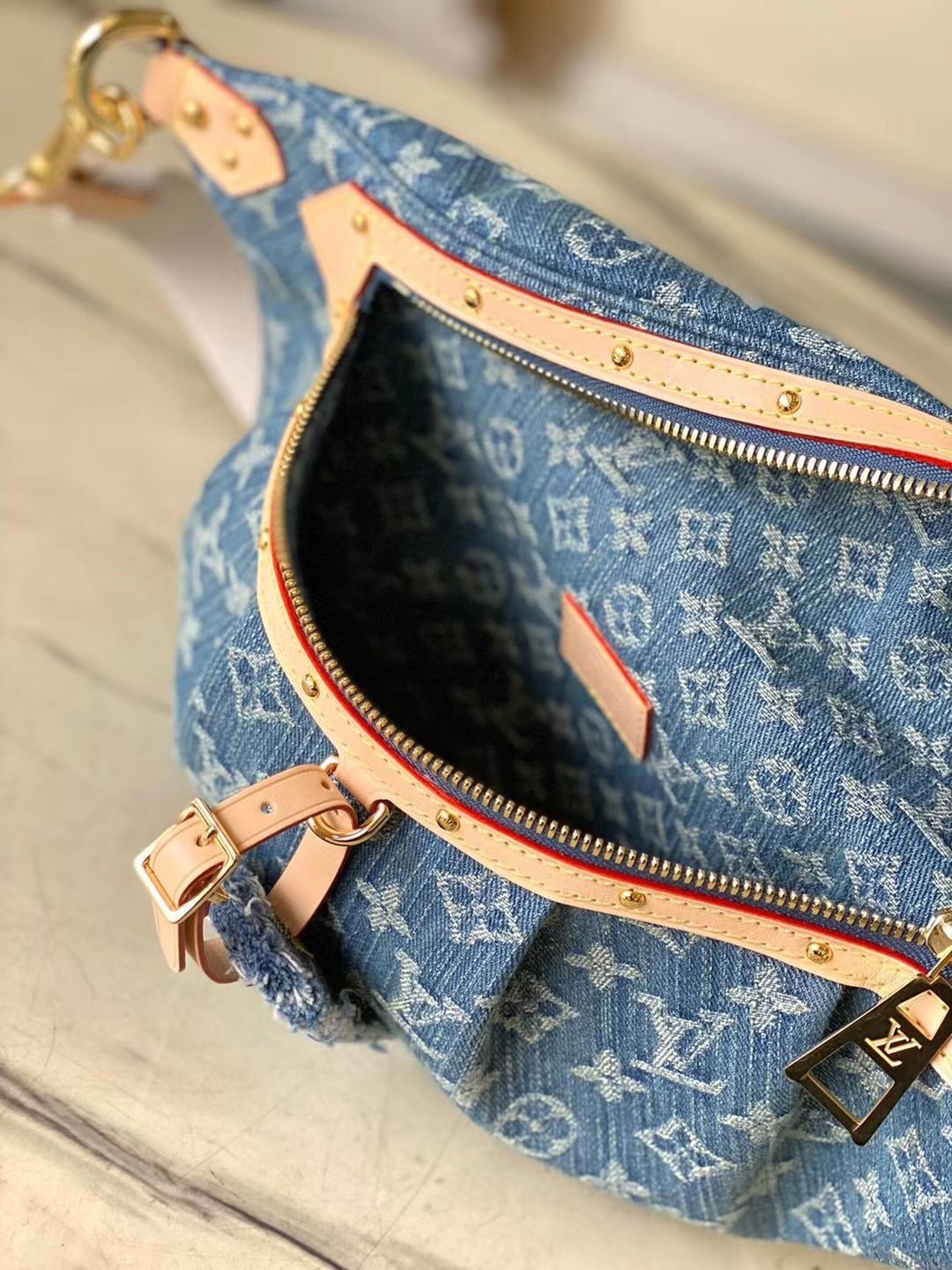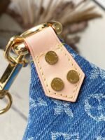 Made from Monogram Denim, the High Rise bumbag is trimmed with natural leather. Notably around the zipper, where the cowhide is adorned with golden studs. A removable name tag, also in distressed Monogram Denim, adds a distinctive touch. The removable and adjustable textile strap gives carry options.