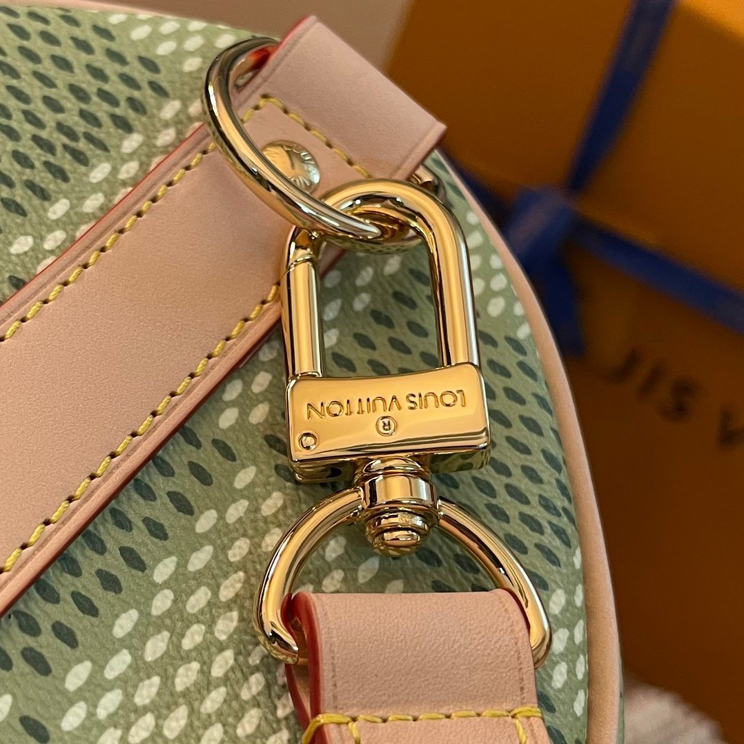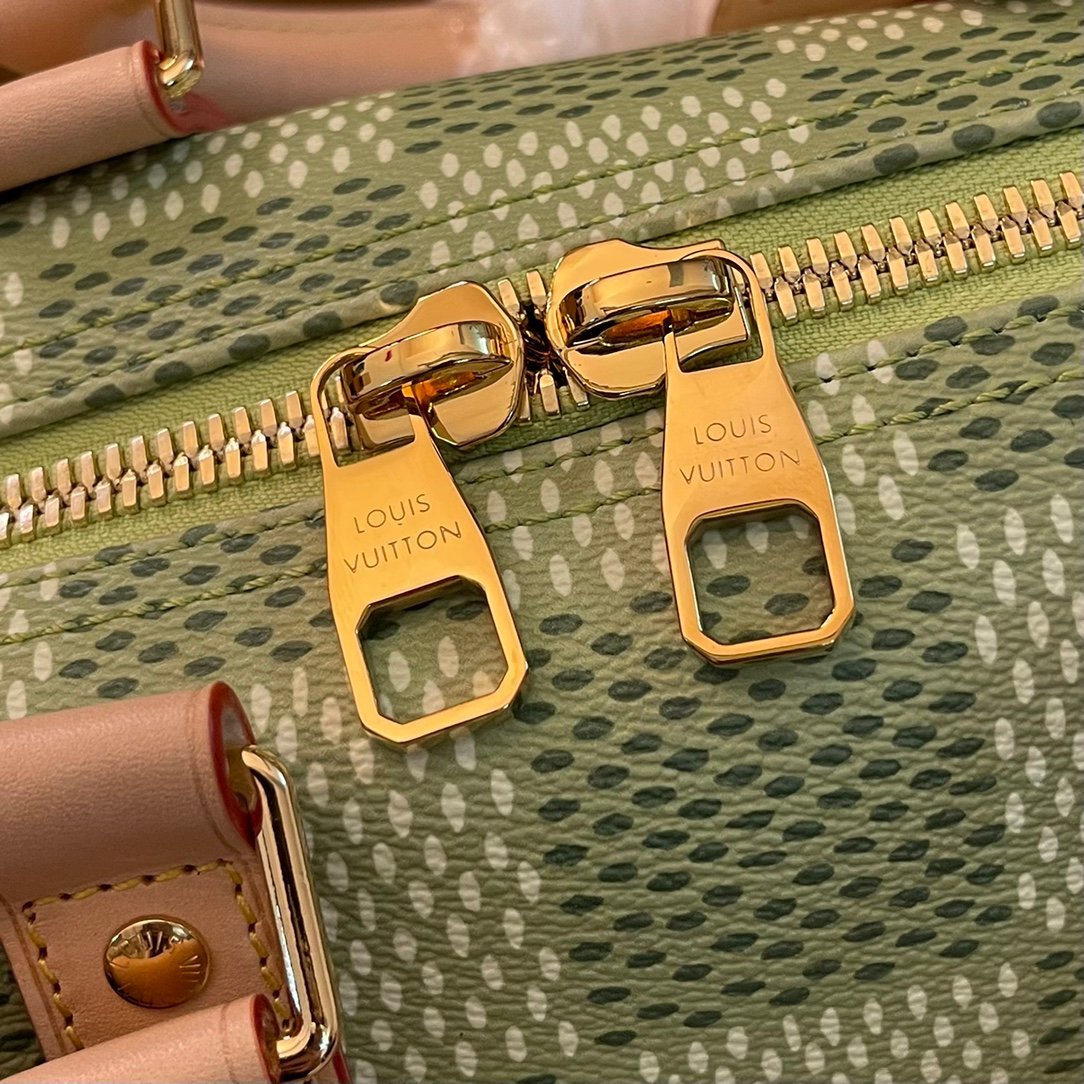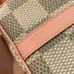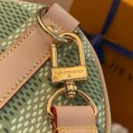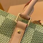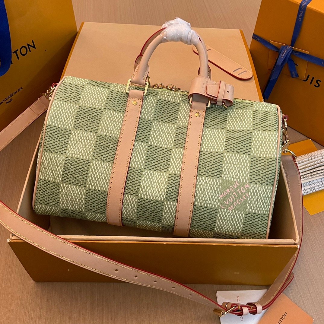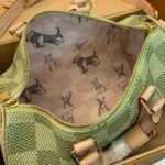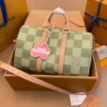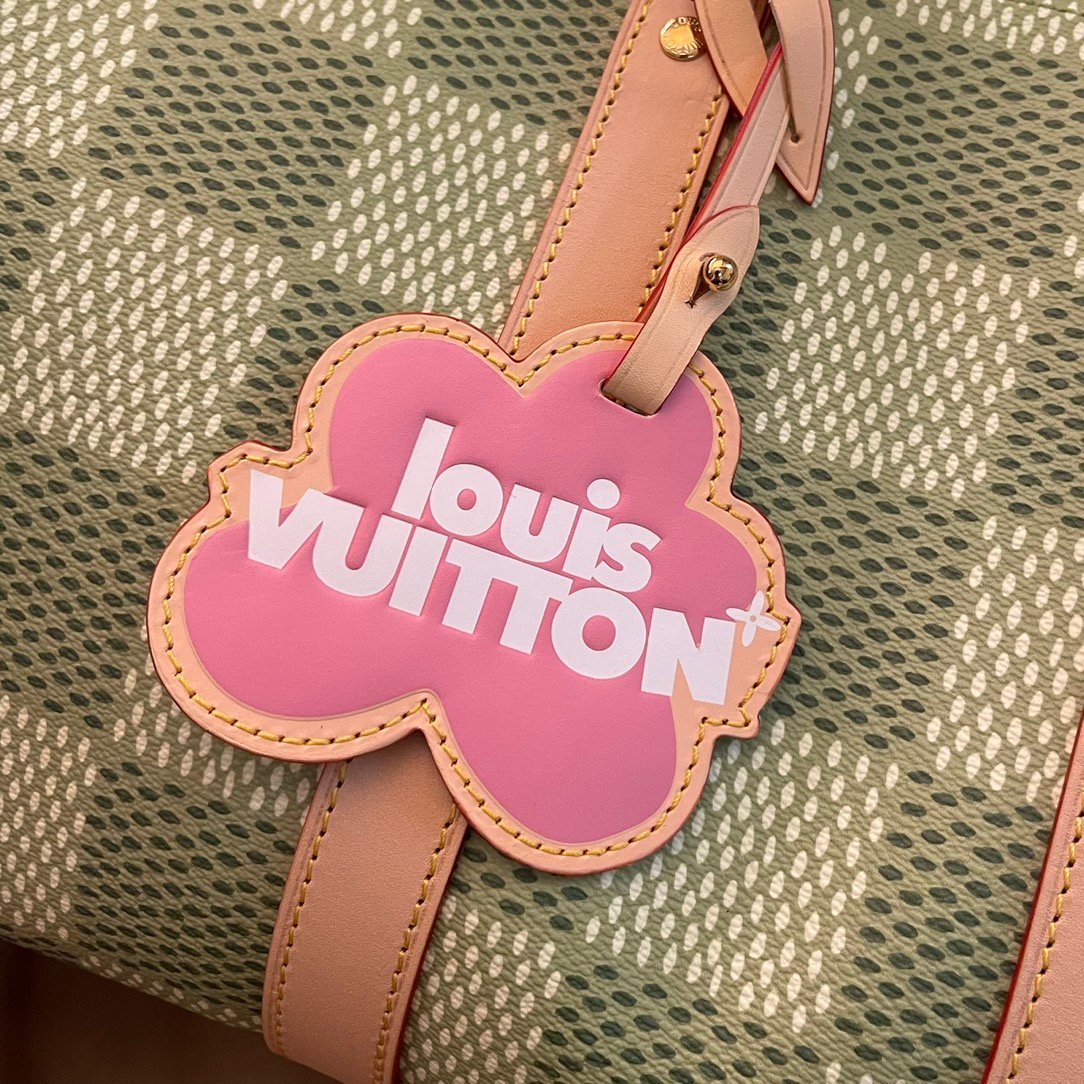 Part of the collaboration with Tyler, this Keepall Bandoulière 35 is fashioned from Damier Golf coated canvas and trimmed with pale cowhide leather. The green colorway is perfectly complemented by the pink Louis Vuitton flower charm and the “L.Vuitton Marque Déposée,” also in pink, in the one of the Damier squares.