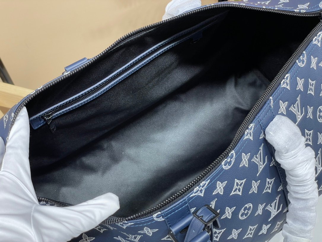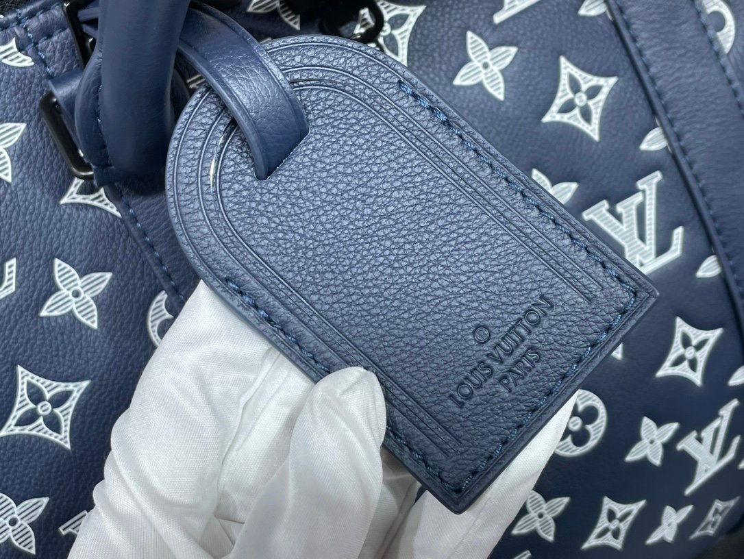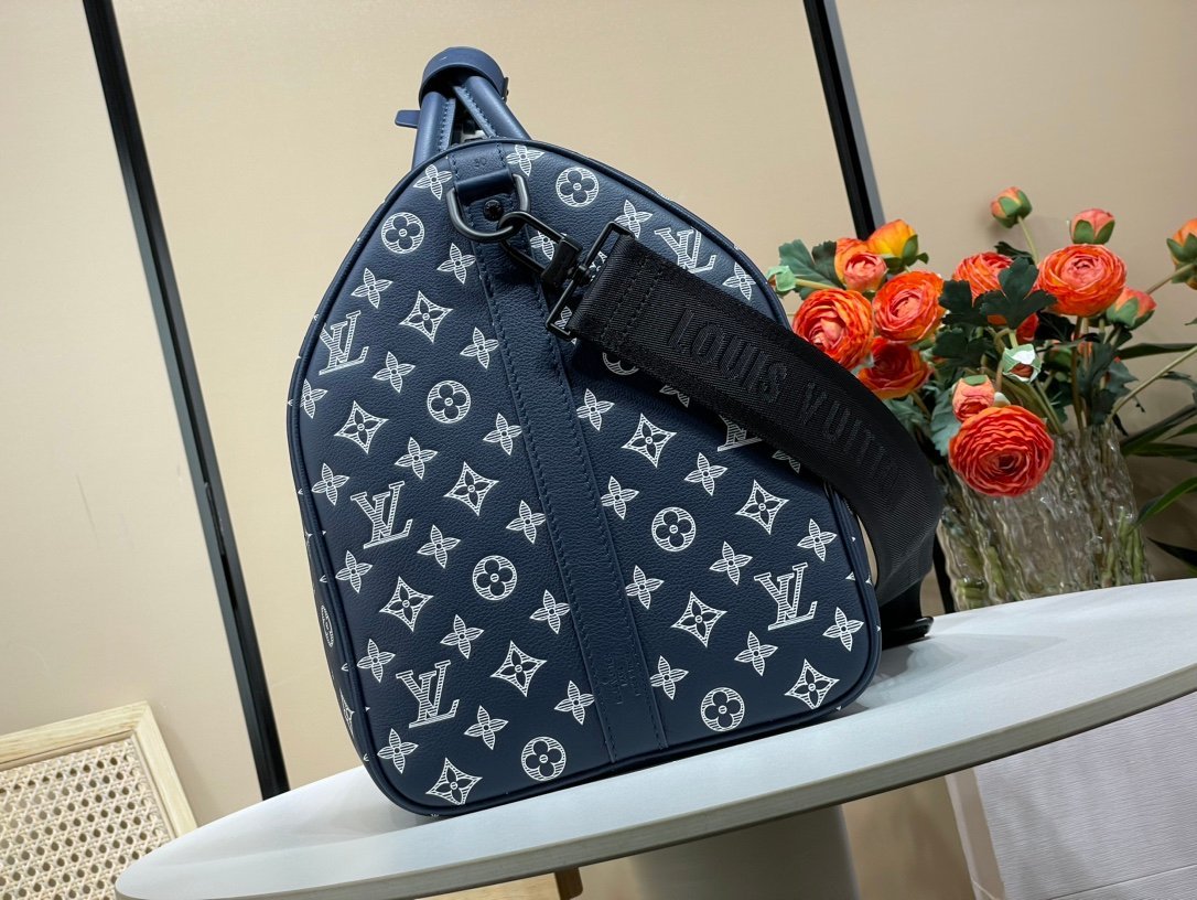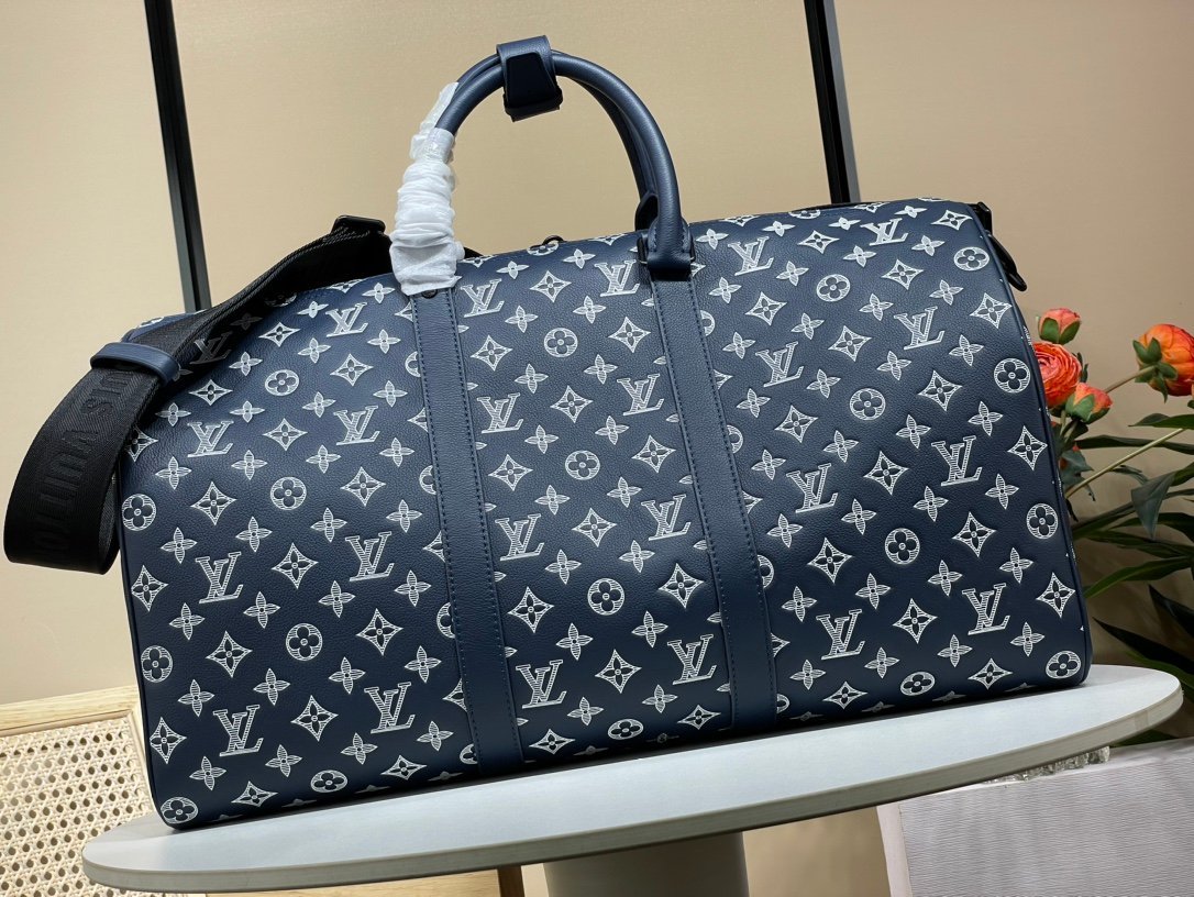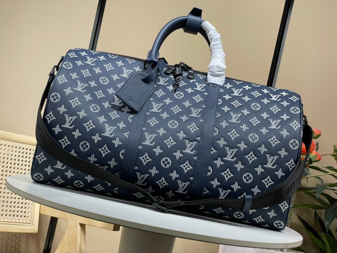 Monogram Shadow calfskin gives this Keepall Bandoulière 50 travel bag a sporty feel. The Monogram pattern is first embossed into the soft calfskin, and then the motif is printed on top in a contrasting color. The process gives depth to the design. The roomy Keepall 50 can be taken onto the plane as carry-on luggage.