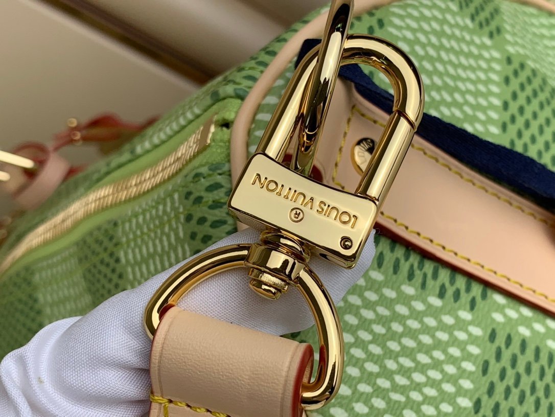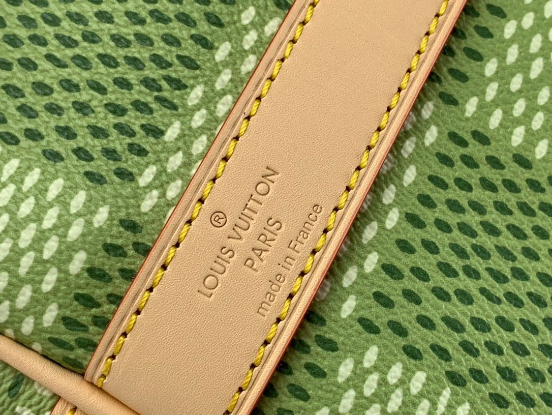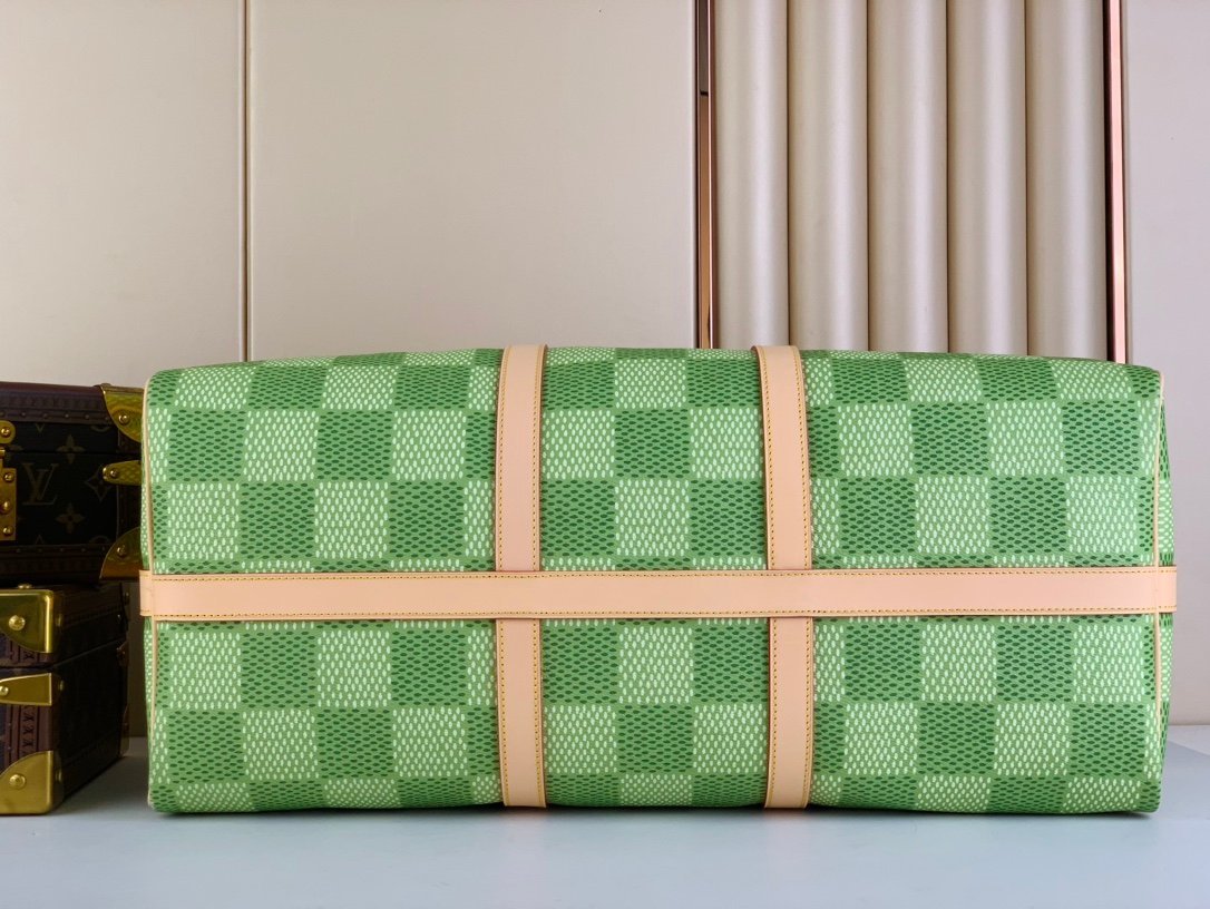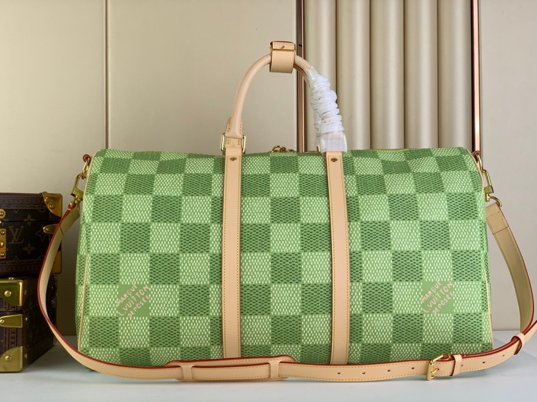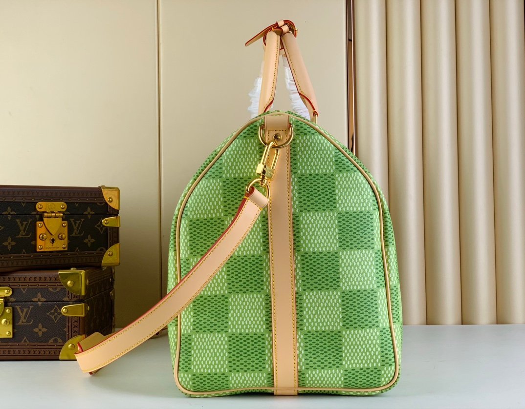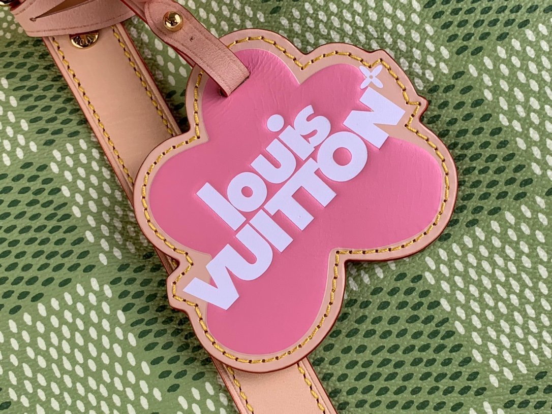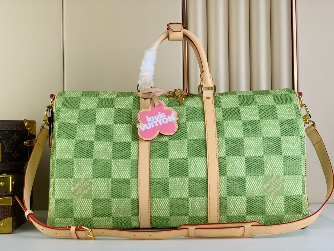 Classic and bold at once, the new Damier Golf coated canvas, with its golf-links inspired colorway, brings panache to the Keepall Bandoulière 50. The bag’s recognizable shape, emphasized by the cowhide-leather side bands and top handles, are signed with a pink Louis Vuitton flower charm. A removable leather strap adjusts for comfortable shoulder carry.