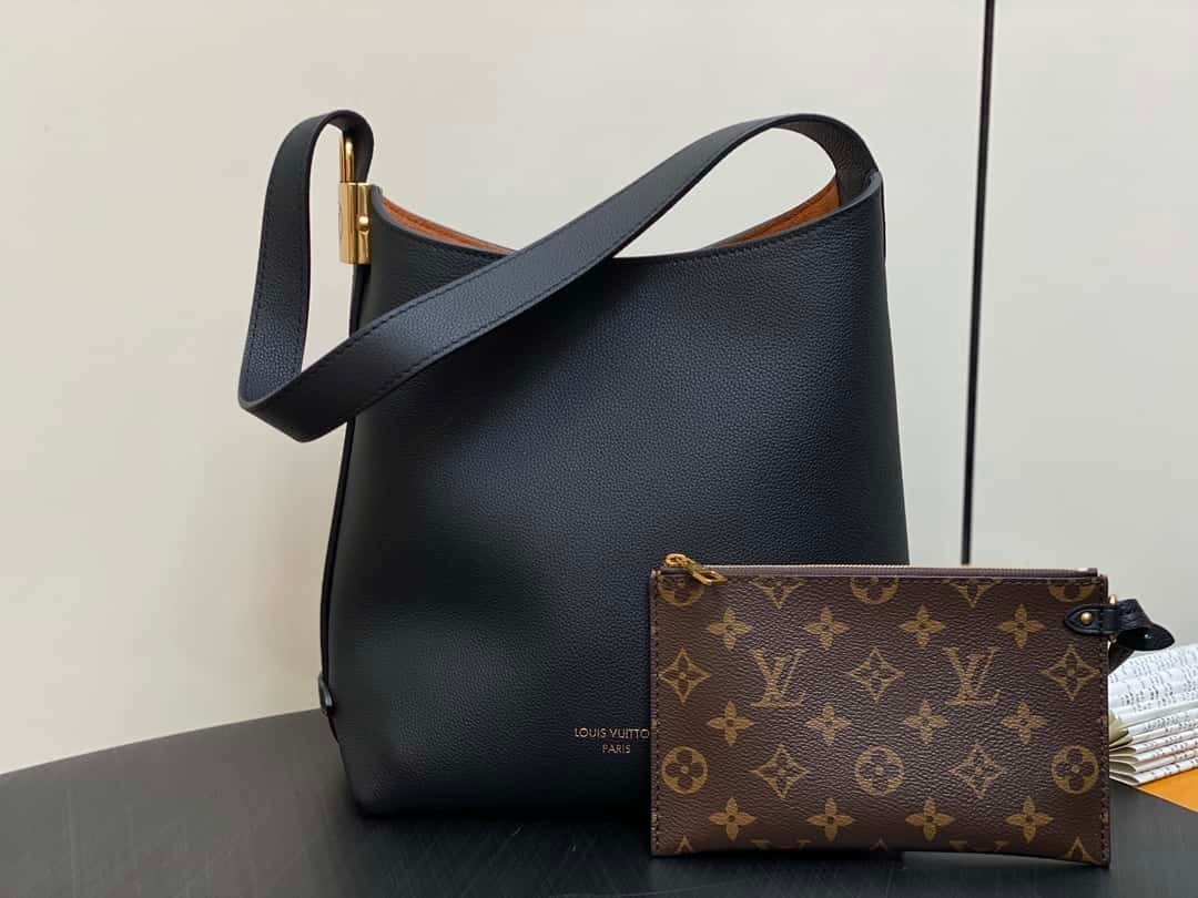 The supple Low Key Hobo PM bag is made from smooth calfskin with suede-calfskin lining. Its unique design includes a single strap that adjusts with a padlock buckle. The interior includes a removable zipped pouch in Monogram canvas to keep things organized. This bag can fit a compact wallet, large smartphone, keys, and other smaller belongings.
