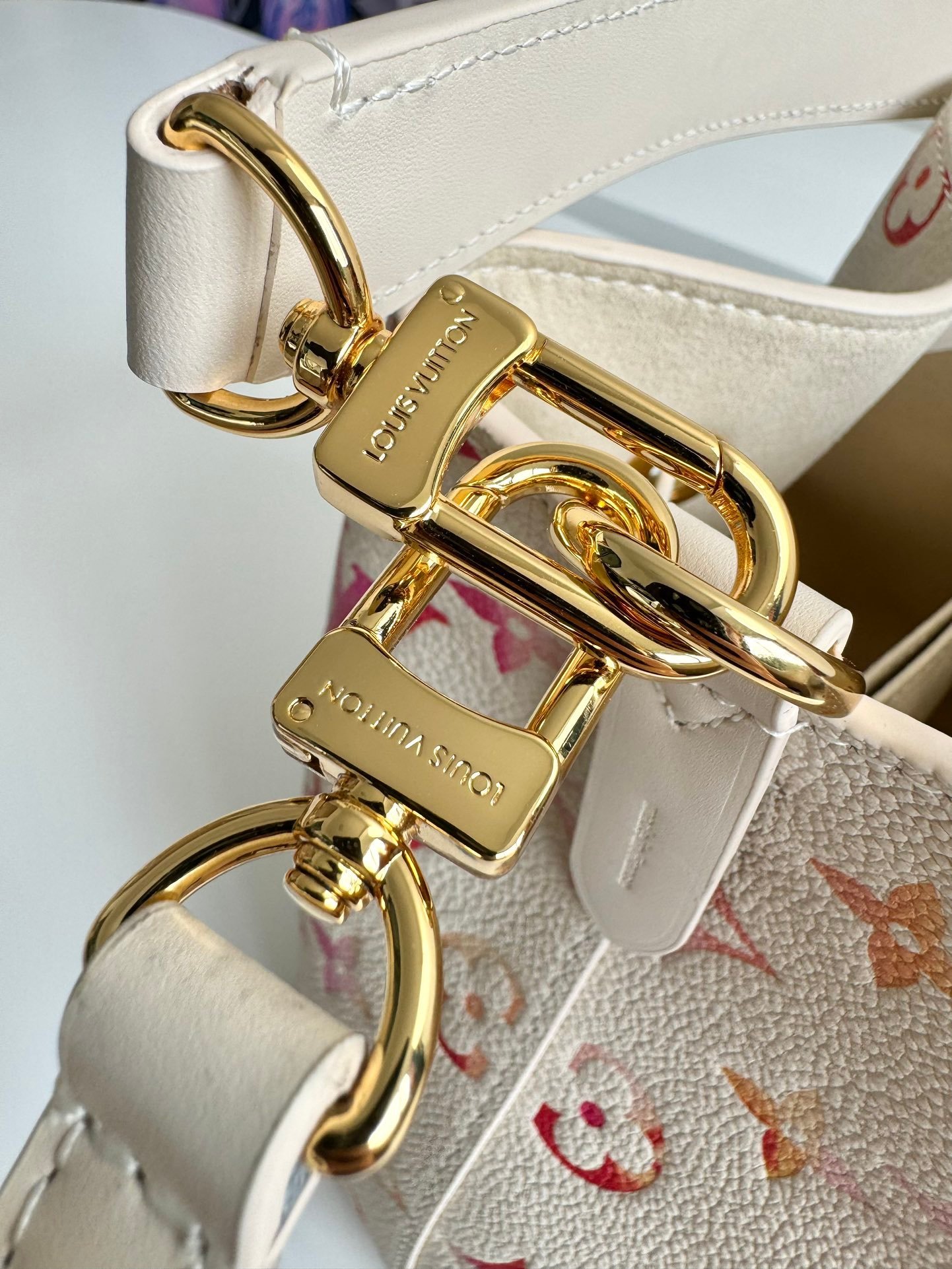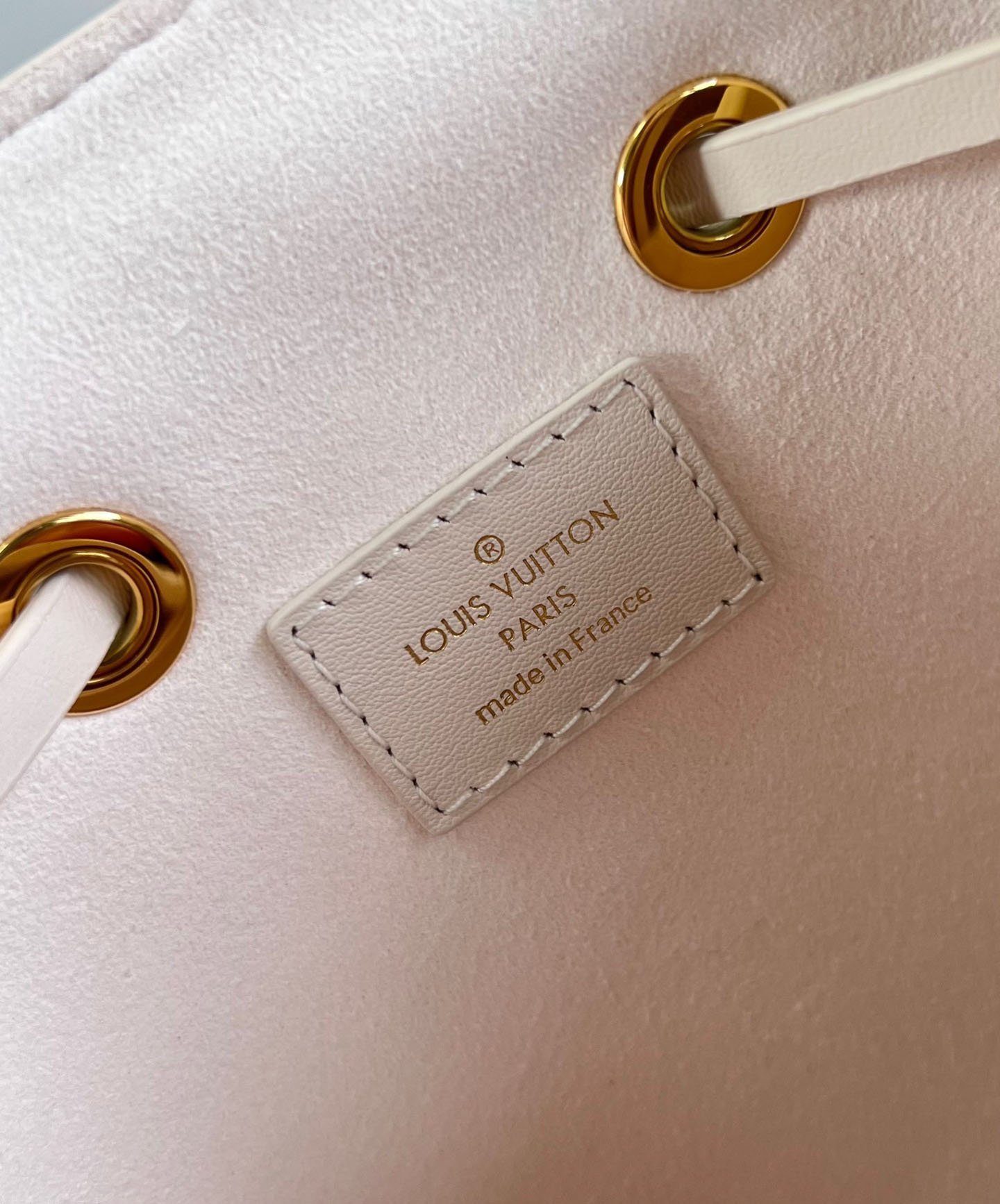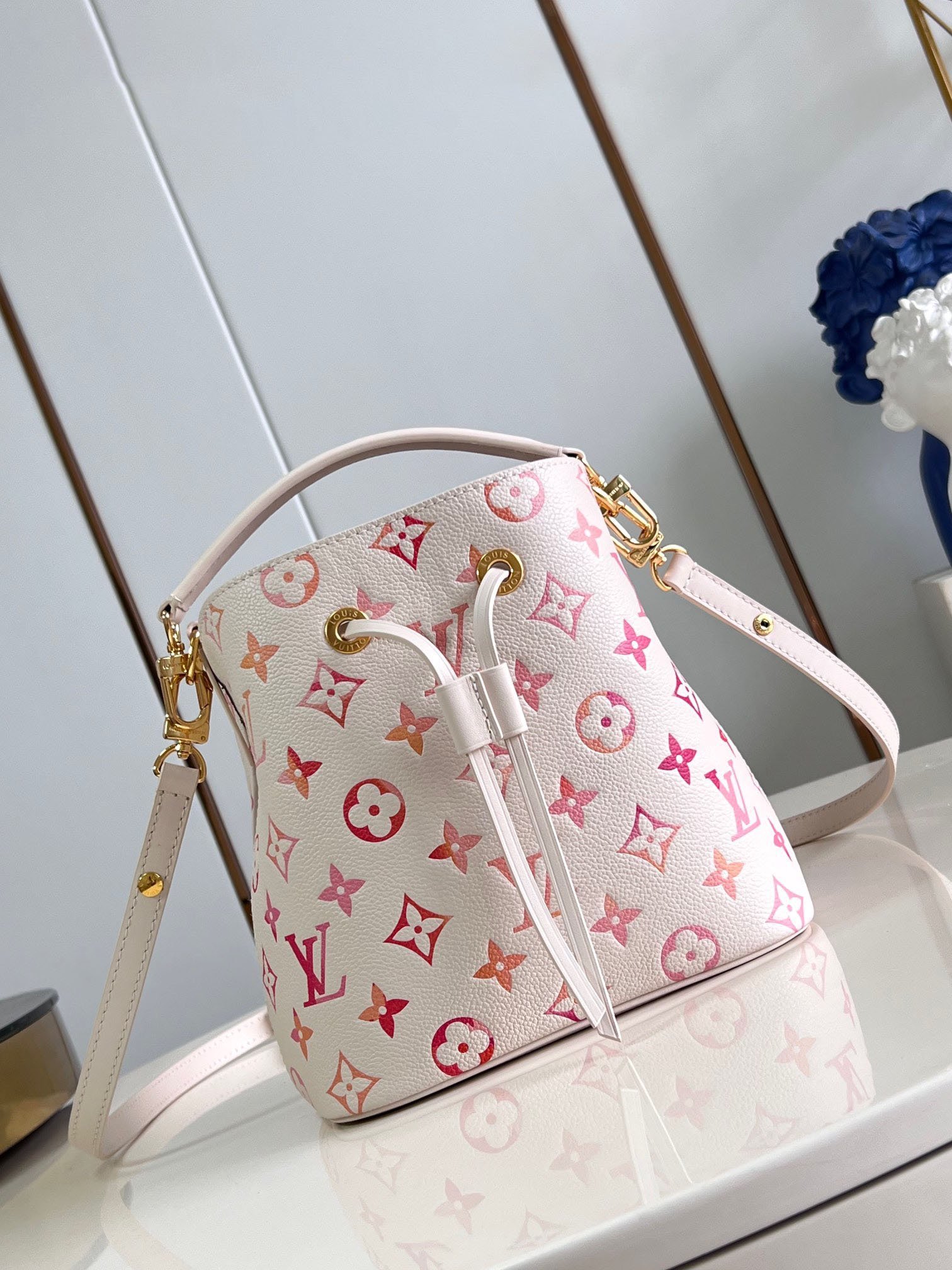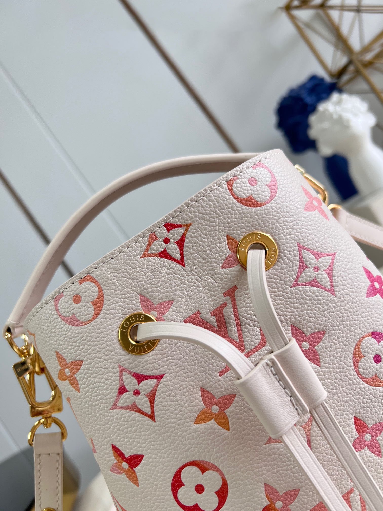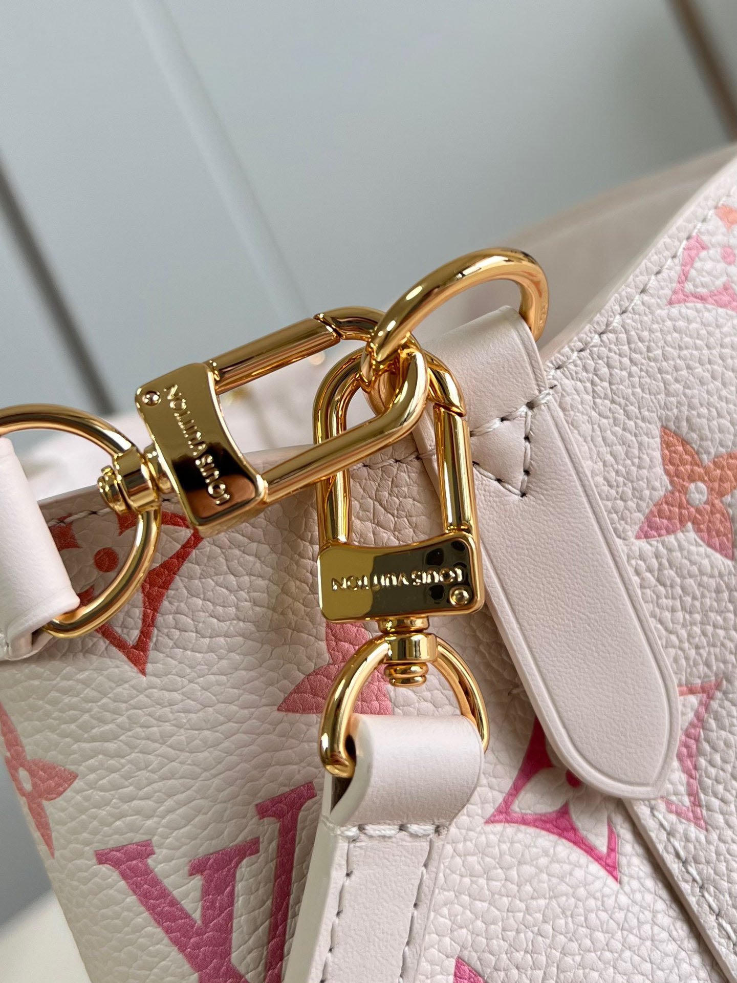 The Aquarelle collection brings a colorful element to the Monogram Empreinte leather of this compact NéoNoé BB bucket bag. Inspired by the soft hues of sunset, a digital printing technique creates orange, pink and fuchsia shades within the Monogram embossing of the leather. A removable handle and a removable and adjustable strap offer multiple carry options.