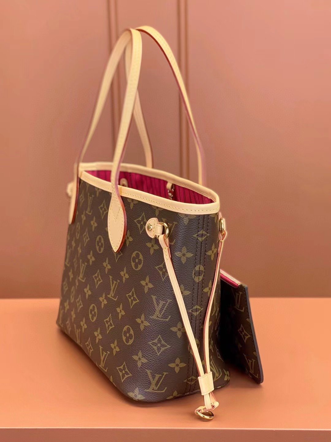The Neverfull PM tote pairs timeless design with heritage details. Crafted from Monogram coated canvas with natural cowhide trim, it is capacious yet not bulky, with side laces that cinch for a sleek allure or loosen for a casual look. Slim, comfortable handles slip easily over the shoulder or arm. Lined in colorful textile, it features a removable pouch which can be used as a clutch or an extra pocket.