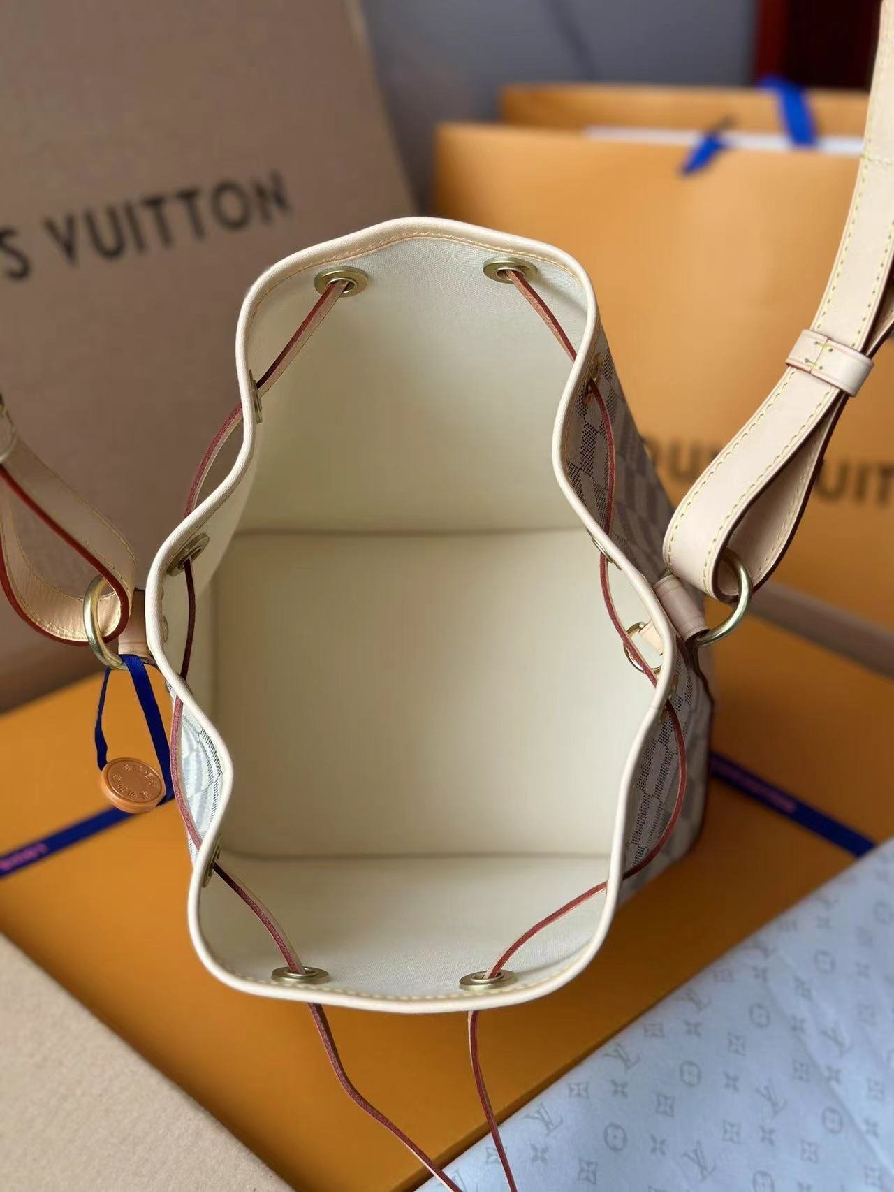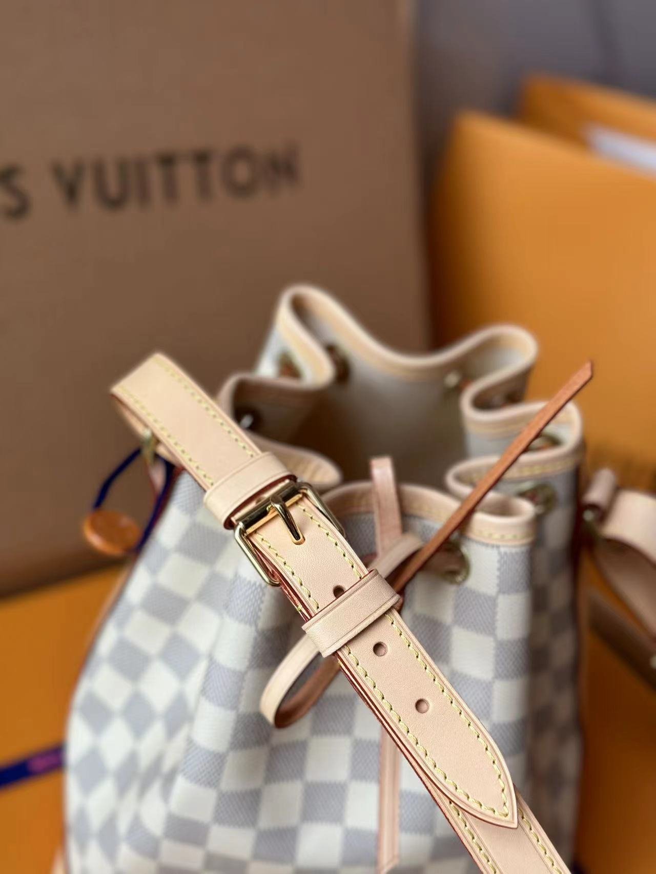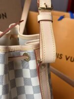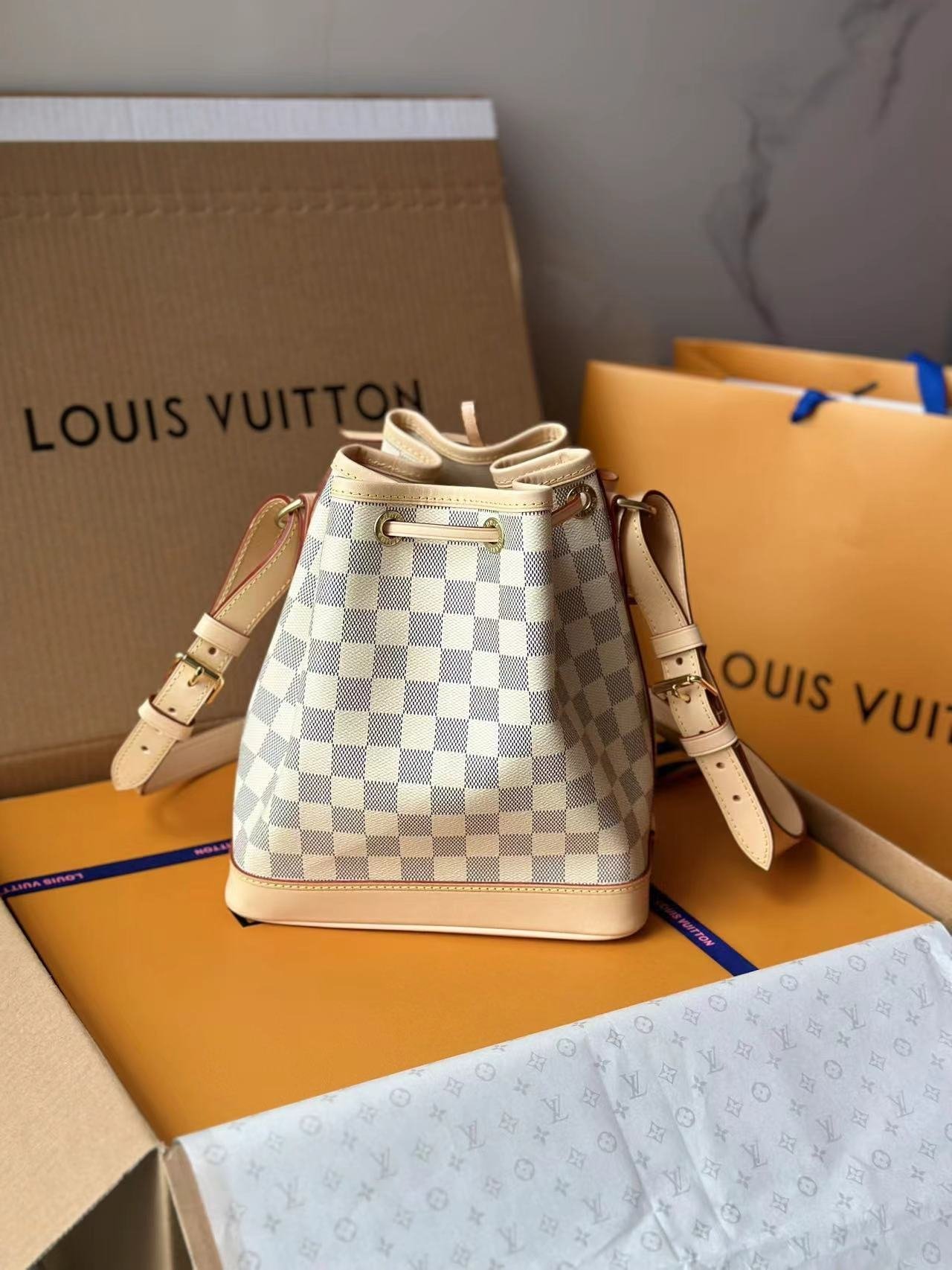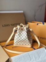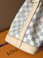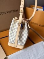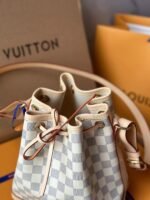 The Noé BB bucket bag harks back to a design from 1932. A Champagne producer asked Gaston-Louis Vuitton to develop a sturdy, stylish bag in which he could transport five bottles of bubbly. This charming version in body-friendly Damier Azur canvas retains key features of the original – the iconic shape and drawstring closure – but is made for modern life. The leather strap adjusts for comfortable shoulder or cross-body wear.